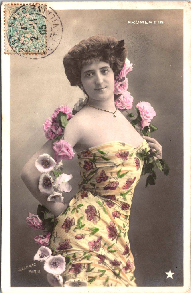 This risque vintage real photo postcard features a fashionable performer named Fromentin.  The card is color tinted. She has a string of flowers wrapped around her shoulders and her dress is a flower pattern. The combination is a nice touch. “The Theatre” (1882) states that Fromentin, among others, present grace and beauty difficult to match. Fromentin was photographed by Sazerac. He was a photographer well known for his portraits of the showgirls of Paris. The publisher of this postcard, was Monsieur G. Piprot, of “Etoille” or “Star” publishing in Paris. The card is part of a series (No.854). The postcard has a postmark from 1905.  SOLD