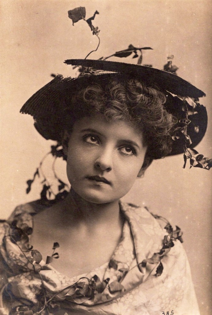 This cabinet card is a portrait of theatre actress, Lorraine Dreux. The image is part of the Newsboy Series (#385) and was published in New York City. The Newsboy series was used for advertising purposes by the Newsboy Tobacco Company. Celebrity photographs were given away as premiums upon the sale of tobacco products. Ms. Dreux looks like she ran through the woods in order to arrive at the photography studio in a timely fashion. She has twigs and leaves on her head and even is wearing a necklace of branches around her shoulders. It seems she is modeling “the natural” look. Her eyes are looking upward, as if to say, “Am I really wearing sticks and leaves?”. Who was Lorraine Dreux? The Illustrated America (1893) describes her as “young and pretty, with soft dark eyes, a tremulous little mouth, and a dazzling complexion”. She was born in Marquette, Michigan, of well to do parents. Her father did a great deal of business in the East and she spent much time on the banks of the Hudson River in New York. She was educated at home by a governess supervised by Dreux’s beautiful mother. She decided that she wanted to be an actress while in her early teens. Her parents reluctantly gave her permission and her first experience acting occurred while she was in London, England, with her mother. She was engaged by Mr Charles Wyndham to play comedy parts in London stage shows. She next joined the London Globe Theatre Stock Company playing sentimental roles. She then joined an English traveling theatre company. She soon returned to America and appeared in a number of plays, including “Ninety Days” with William Gillette. The article closes with the prediction that Dreux would be a successful actress in America because she possessed both beauty and talent. The New York Times (1894) reported on Dreaux’s appearance in “Lem Kettle” at the Bijou theatre. She also appeared in “Rush City” (1894) which was staged in Brooklyn (New York), and also in “Nance Oldfield” (1896) in New York. Dreux appeared in one Broadway production, “The Spectator” (1896). The New York Dramatic Mirror (1908) reported the tragic death of Lorraine Dreux. She was described as a well known and capable leading women of many stock companies outside of New York City. She died in New York’s Bellvue Hospital at age 35. The article reports that she “had fallen on evil days” and was “too proud to let her friends know of her plight”. She let an illness go till it turned into acute pneumonia which led to her death. Her last two engagements were in Worcester, Massachusetts and Rochester, New York. She received excellent reviews for her acting in both productions. However, her wardrobe was stolen and she was criticized for the way she dressed for her part in Rochester. She returned home “down hearted and discouraged” and sick, penniless and homeless. She met an old friend on the streets of New York who took her home to be fed and cared for but her condition worsened. A collection was made from other actors and actresses and the money was used to admit her to Bellvue Hospital where she died. Aid from the Actors Fund paid for her funeral and burial at Evergreen Cemetery. (SOLD)