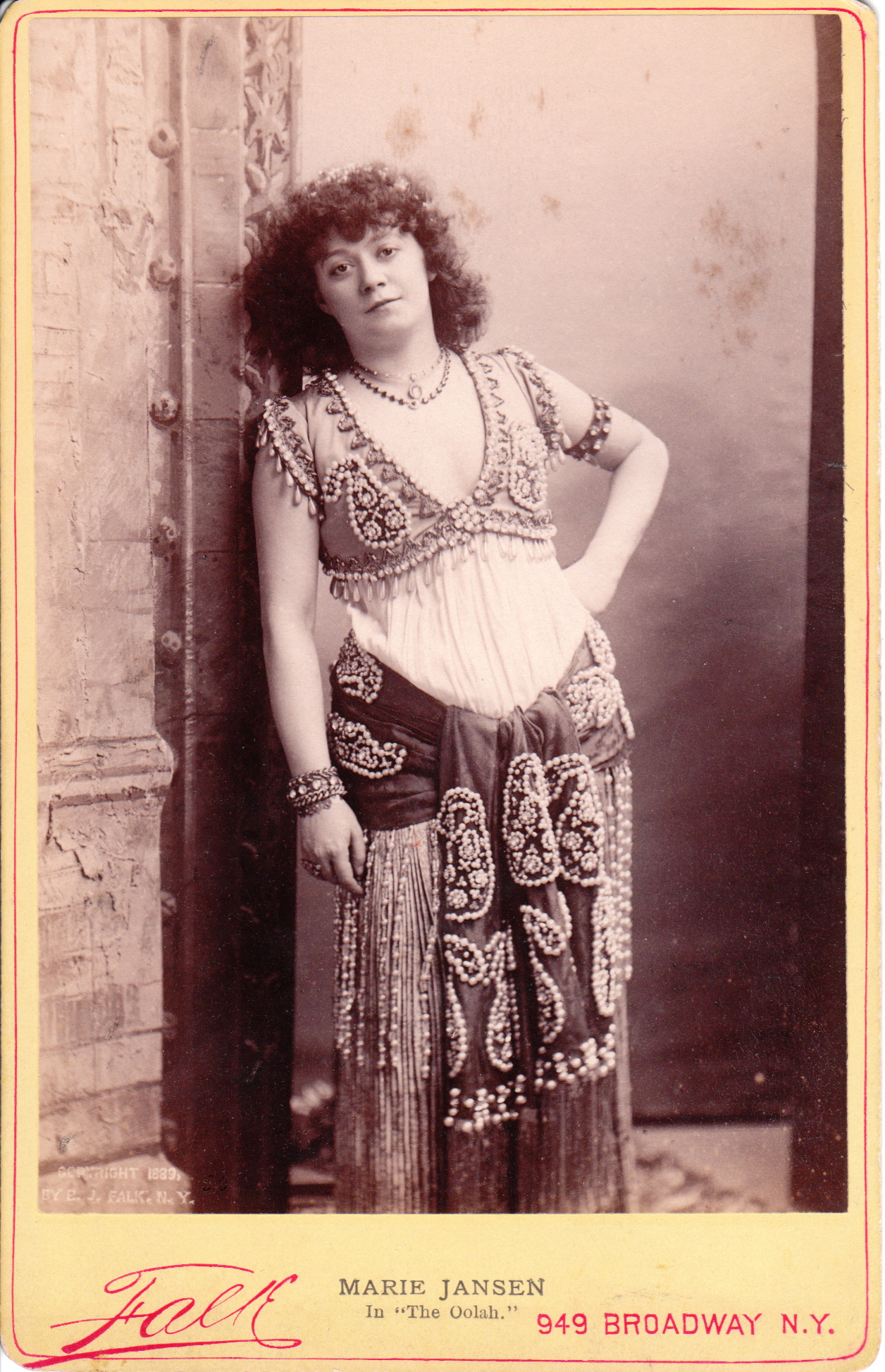 Postcard 3 was also photographed by Falk. This cabinet card is dated 1888 and is a bit risque for that time in history. The third image of Jansen also captures her in a bit risque costume. It was photographed by  Falk in 1892 and the cabinet card was used as a premium for Newsboy tobacco products.