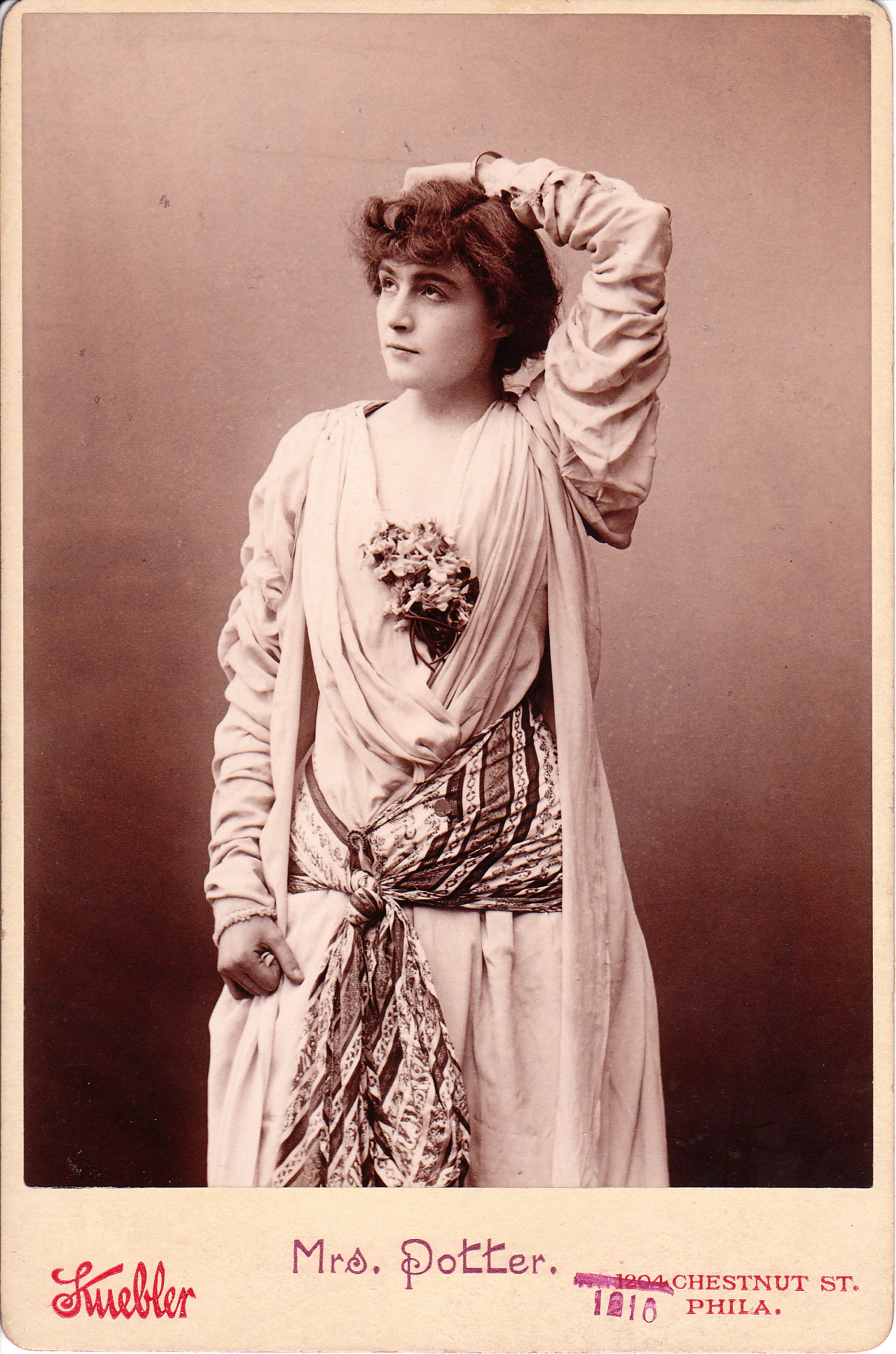 The Cabinet Card 2 photograph of Cora Potter was photographed by Kuebler of Philadelphia, Pennsylvania. She appears to be in costume and is clearly a beautiful woman with fetching eyes. To view other photographs by and to learn more about Kuebler, click on the category “Photographer: Kuebler”.