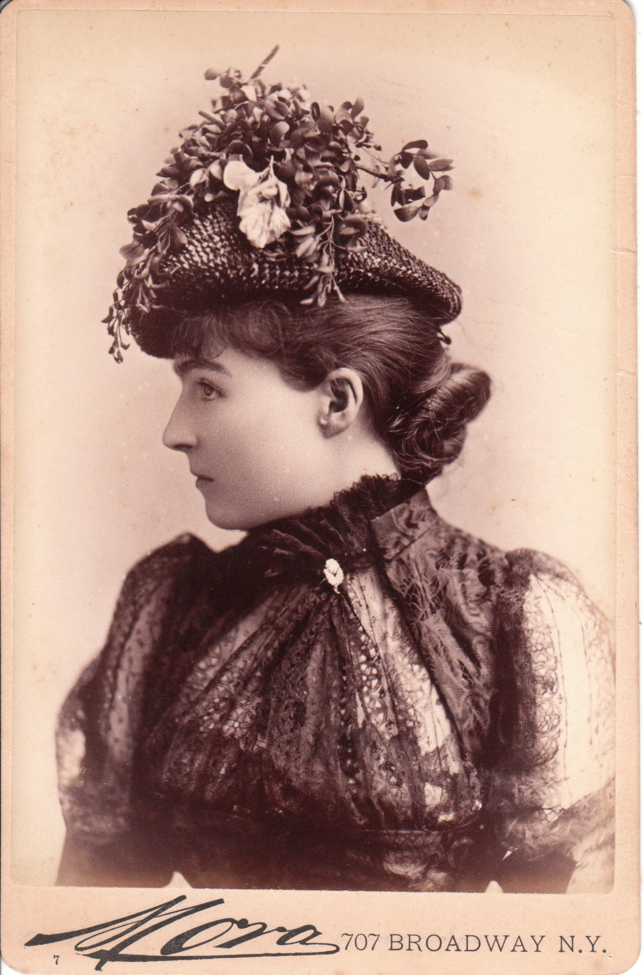 The Cabinet Card 3 photograph of Mrs Potter was produced by Jose Maria Mora, a celebrity photographer based in New York City. The image was part of a series (#7). To view other photographs by this photographer, click on the category “Photographer: Mora”. Mrs Potter looks quite elegant in this cabinet card portrait. Her hat can best be described as “floral”. The photograph is stamped on the reverse with the name of the gallery that originally sold it (“John Hoch Art Store, 118 Court Street, Boston”). Hoch’s obituary appears in the Bulletin of Photography and the article reports that he was the first among Boston’s photographers to sell photographs of celebrities. He had been engaged in the photography and picture frame business in Boston for more than fifty years. The obituary mentions that he was of German heritage and was 84 years old at the time of his death. His cause of death was cerebral hemorrhage.