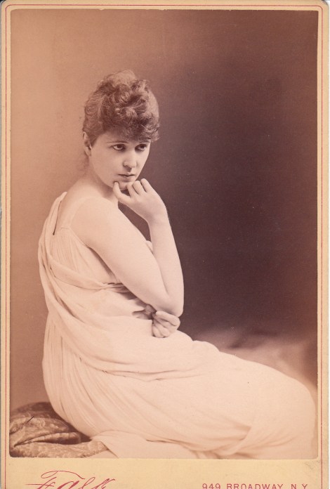 In the top photograph she is holding a fan and her expression could be described as coy. She is adorned with a great deal of jewelry including multiple rings, a hair pin and a pin on the midsection of her dress. The photographer of this image, as well as the next four images, is Morrison, of Chicago, Illinois. The photographs have a copyright date of 1894. Morrison was a well known celebrity photographer and his studio was housed in the Haymarket Theatre. To view other photographs by Morrison, click on this site’s category “Photographer: Morrison”.