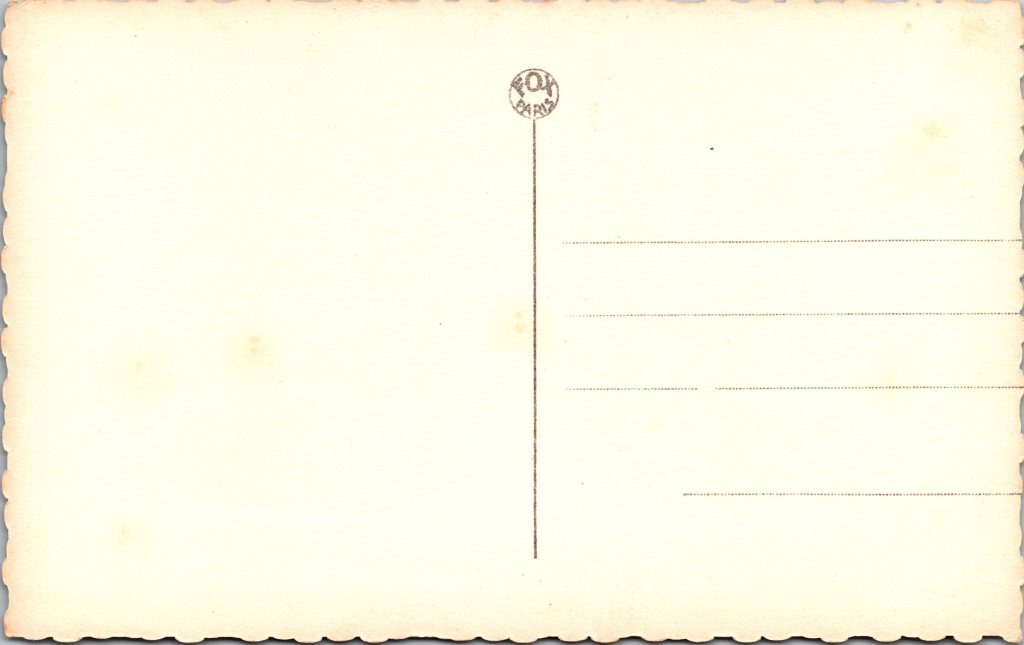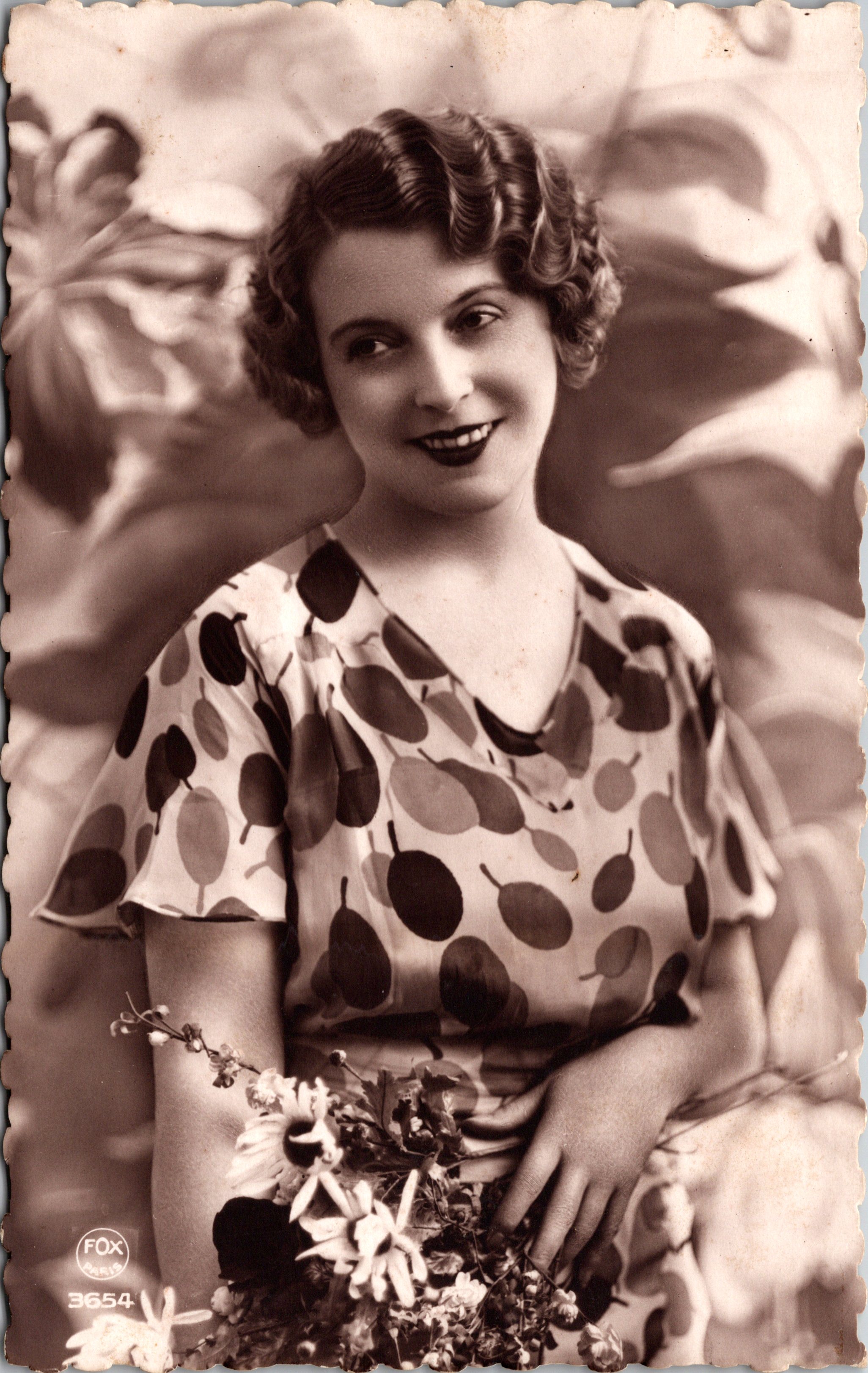 This scallop edged vintage postcard features a pretty young woman wearing a colorful patterned dress. Her dress appears to feature different covered leaves. This postcard model has a woderful smile. This postcard was published by Fox (Paris) as part of a series (No.3654). The postcard is in very good condition (see scans).