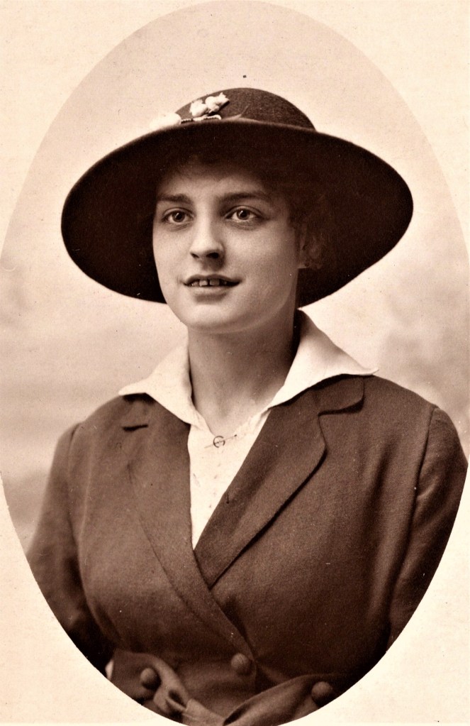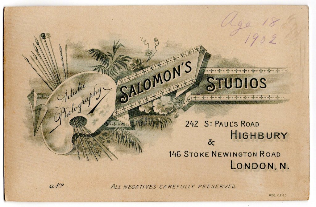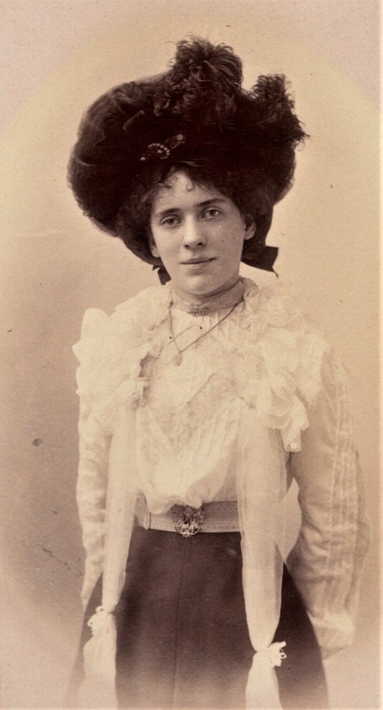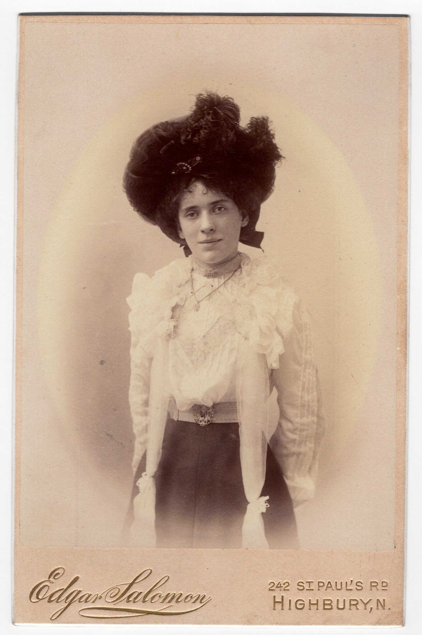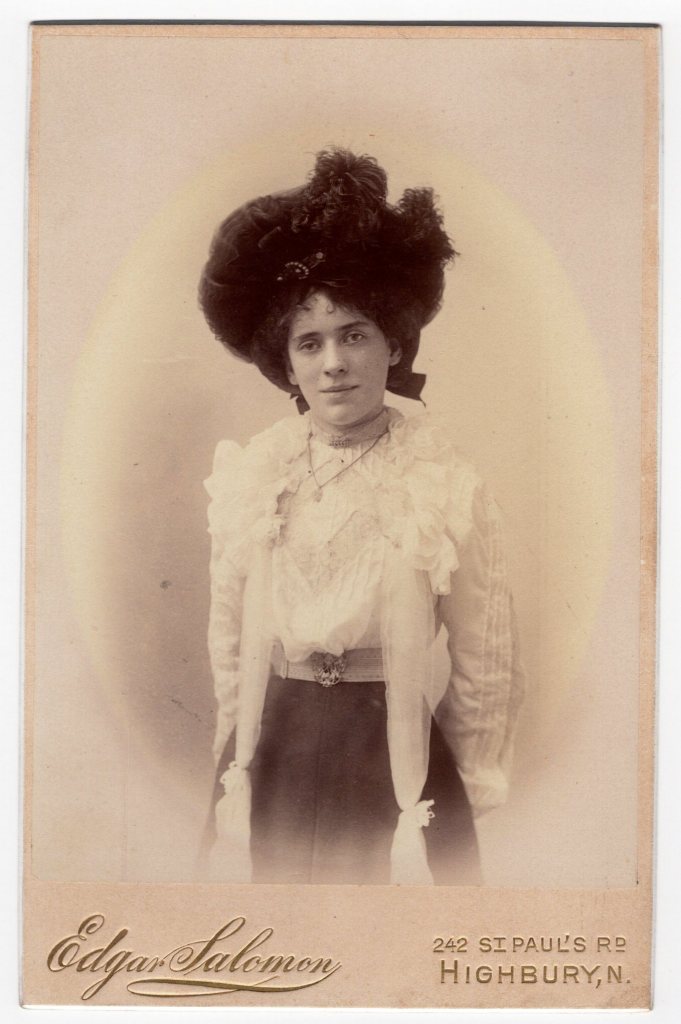 An internet dictionary defines funky as ” modern and stylish in an unconventional or striking way”. The pretty young lady in this cabinet card photograph is certainly dressed in a funky manner. She has a great smile and is remarkably well poised as she stands before the camera. Her scarf appears to be made of a fine fabric, and seems to be tied at the ends by ribbons. She is wearing an interesting belt with a decorative buckle. She is also wearing a terrific hat. Note her necklace and the brooch at her collar. A pencilled notation on the reverse of the cabinet card indicates that the young woman in the image is eighteen years of age and that the photograph was taken in 1902. The photographer was Edgar Salomon. He had a studio in two English cities; Highbury and London. This cabinet card portrait is in very good condition (see scans).