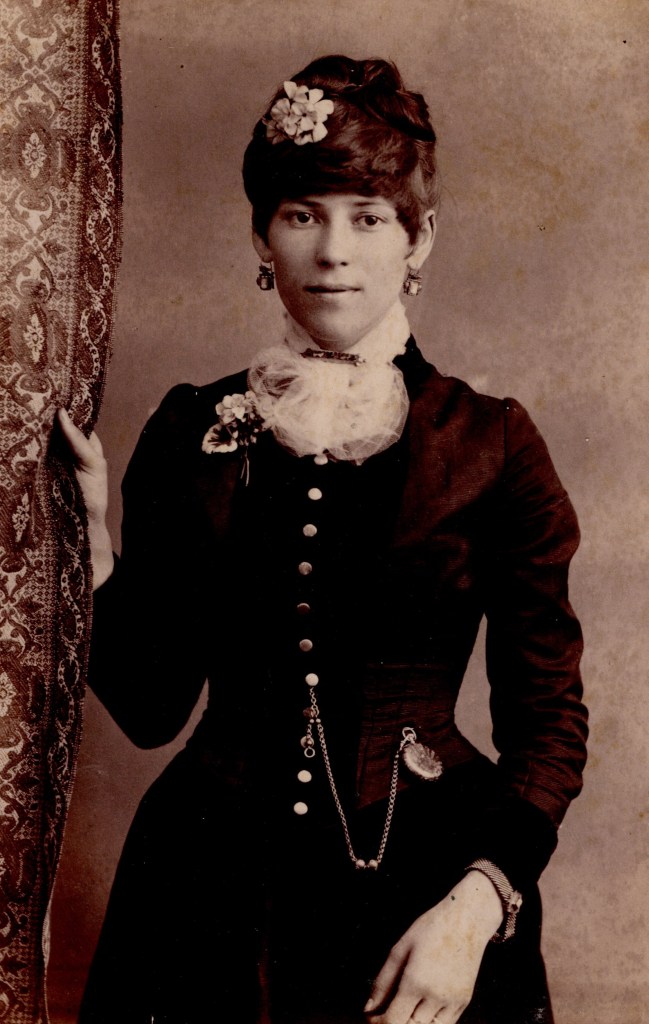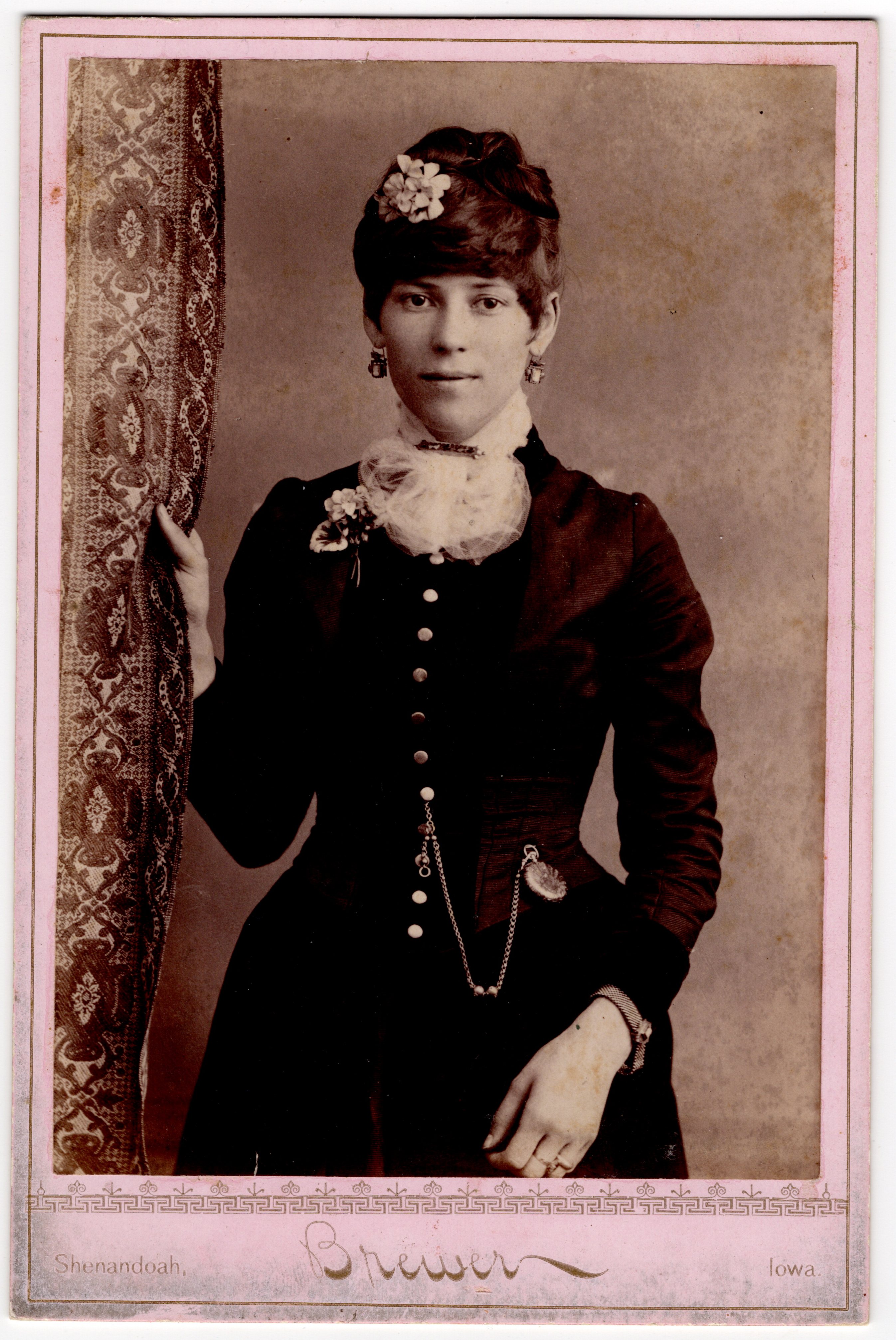 This cabinet card features a portrait of a pretty and fashionable young woman. This fashionista is wearing a dark dress with lace, earrings, collar pin, rings, and flowers in her hair and pinned to her lapel. Note her pocket watch. This cabinet card photograph was taken at the W. H. Brewer studio. The studio was located in Shenandoah, Iowa. William Henry Brewer was born in Indiana in 1838. He lived at home with his father until he was 25 years-old (1862) when he married Mary Ann Proctor. In 1869, he and his wife went west to Tarkio, Iowa and tried their hand at farming. Farming did not work out very well, and he moved to Red Oak where he sold groceries, with moderate success, for three years. In 1874, he established a photography rail car in Shenandoah and intended to do business there as well as in neighboring communities that he visited along the rail. Business was excellent in Shenandoah, so attaching his studio to a train was not necessary. He then opened a modern photography studio store front which grew over time. Brewer’s business made him one of the more financially successful citizens of Shenandoah. SOLD