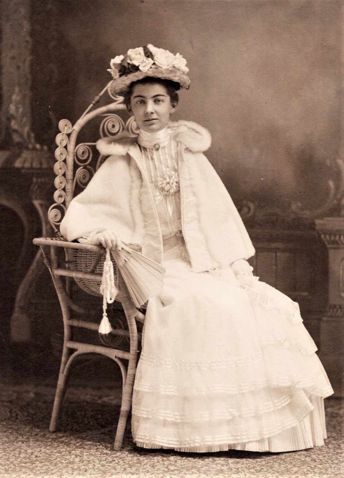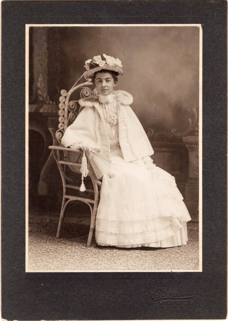This vintage photograph features a woman who can be best described as a fashionista. She is wearing what has been described by a viewer as a “Winter White Ensemble”. Note the fur cape, bustled dress, flowered hat, gloves, and the fan in her right hand. This photograph was taken by C. D. Andrews, who operated a studio in Lakeport, New Hampshire. This soft focus portrait was beautifully done by the Andrew studio. (SOLD)
