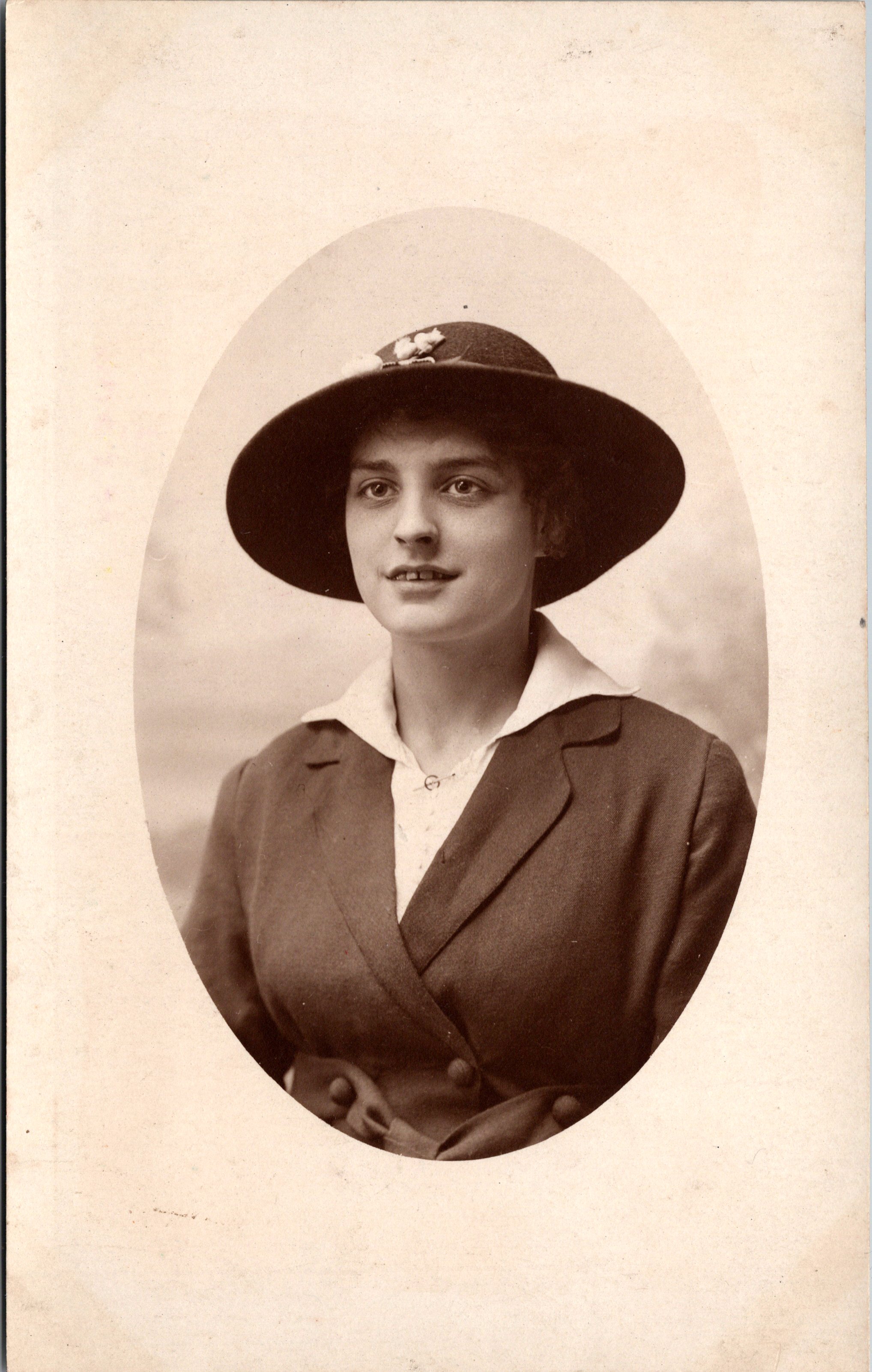 This vintage postcard features a pretty young woman dressed for success. She is dressed like a professional career woman of today. She is fashionable but staid. She has a wonderful smile. This is a studio postcard very likely is one of a kind. The postcard is in very good condition (see scans).
