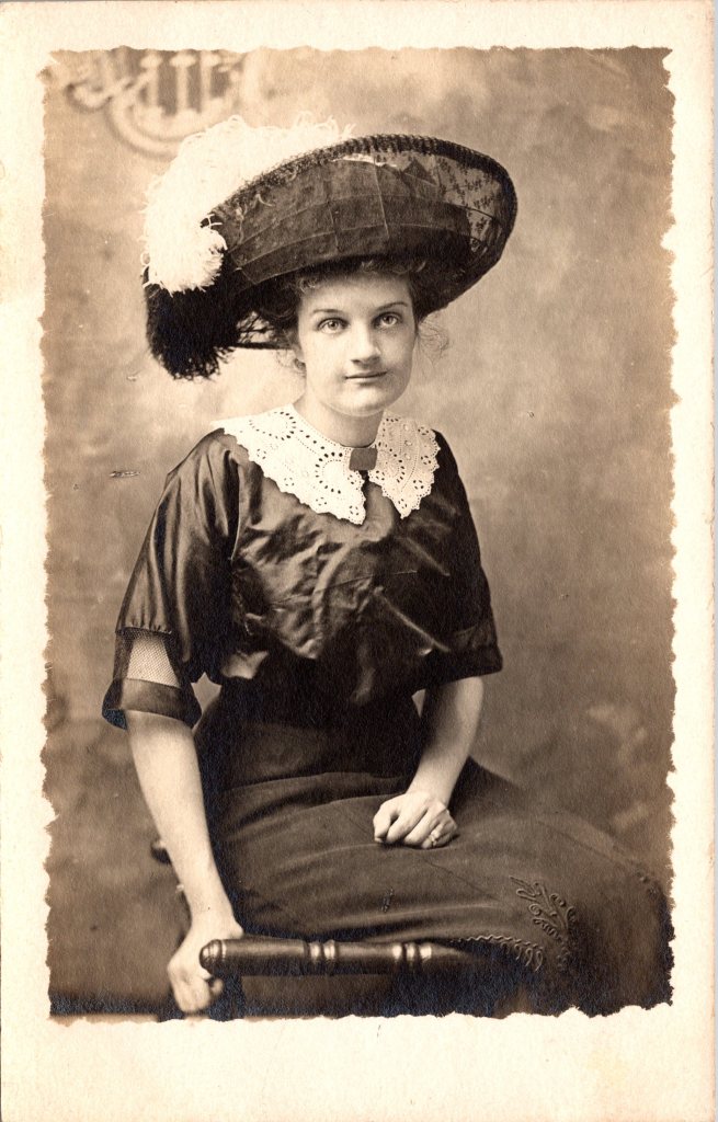 FASHIONABLE WOMAN : EMBROIDERED DRESS : GIANT FEATHERED HAT : RPPC (1907 – 1917)