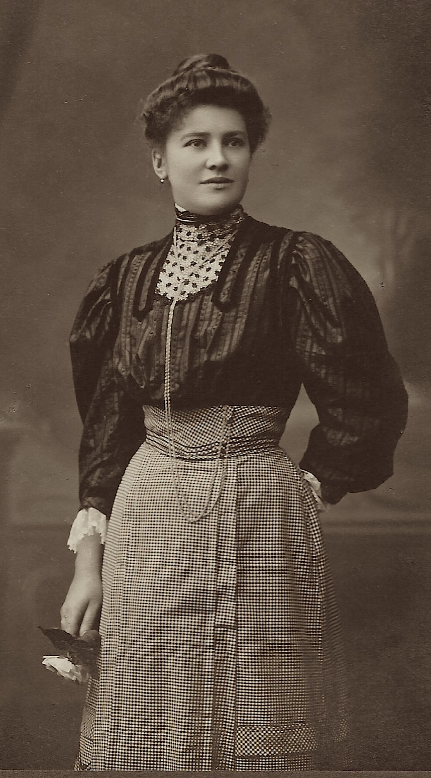This cabinet card features a young woman with a flair for fashion. She is most certainly what we call today, a “fashionista”. She looks absolutely beautiful. Her checkered dress is pretty, and unusual for this era’s photographs. I do not know what she is wearing around her collar. Is it part of her dress, or is it an accessory? The young lady is beautifully posed and has a magnificent smile. The stemmed flower in her right hand is a nice touch. The talented photographer of this image is Franz Stulz. He operated a studio in Lundenberg, Germany. SOLD