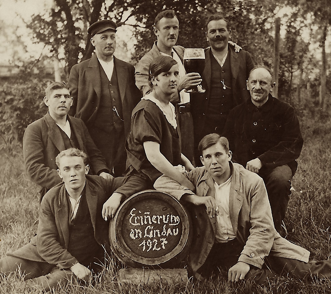 This vintage real photo postcard features a group of German beer lovers gathered around a keg in a country-side setting. This photograph is a treasure trove of interesting elements. First, the keg of beer is labelled with the title “Memories in Lindau 1927” (translated from German). Second,the bruiser in the center of the back row is holding a beer mug on steroids. It is likely that no one will challenge or fight him for the huge glass of dark beer. Finally, what is the story about the gentleman/lady in the center of the middle row. To quote the Kinks, “Girls will be boys, and boys will be girls”. It is likely that the man wearing the dress, seen in this postcard, did so for fun. It is not unusual to see cross dressing in photographs from this era. Generally, wearing opposite sex clothing in these images was done for entertainment, rather than for sexuality reasons. Women also dressed as men in photographs. Vesta Tilley (1864-1952) was an English music hall performer who was one of the most famous male impersonators of her time. She was a star in both Britain and the United States for over three decades (see her photo below). Returning to the subject of the beer drinking celebrants, we learn from the writing on the keg, that they are partying in Lindau, Germany. Lindau is a major town and an island in Bavaria. It is located on the eastern side of Lake Constance (Bodensee in German). The origin of Lindau’s name is thought to be the “linden tree”. Lindau is known for being near the Austrian, German, and Swiss borders. This vintage postcard has excellent clarity and is in very good condition (see scans).
