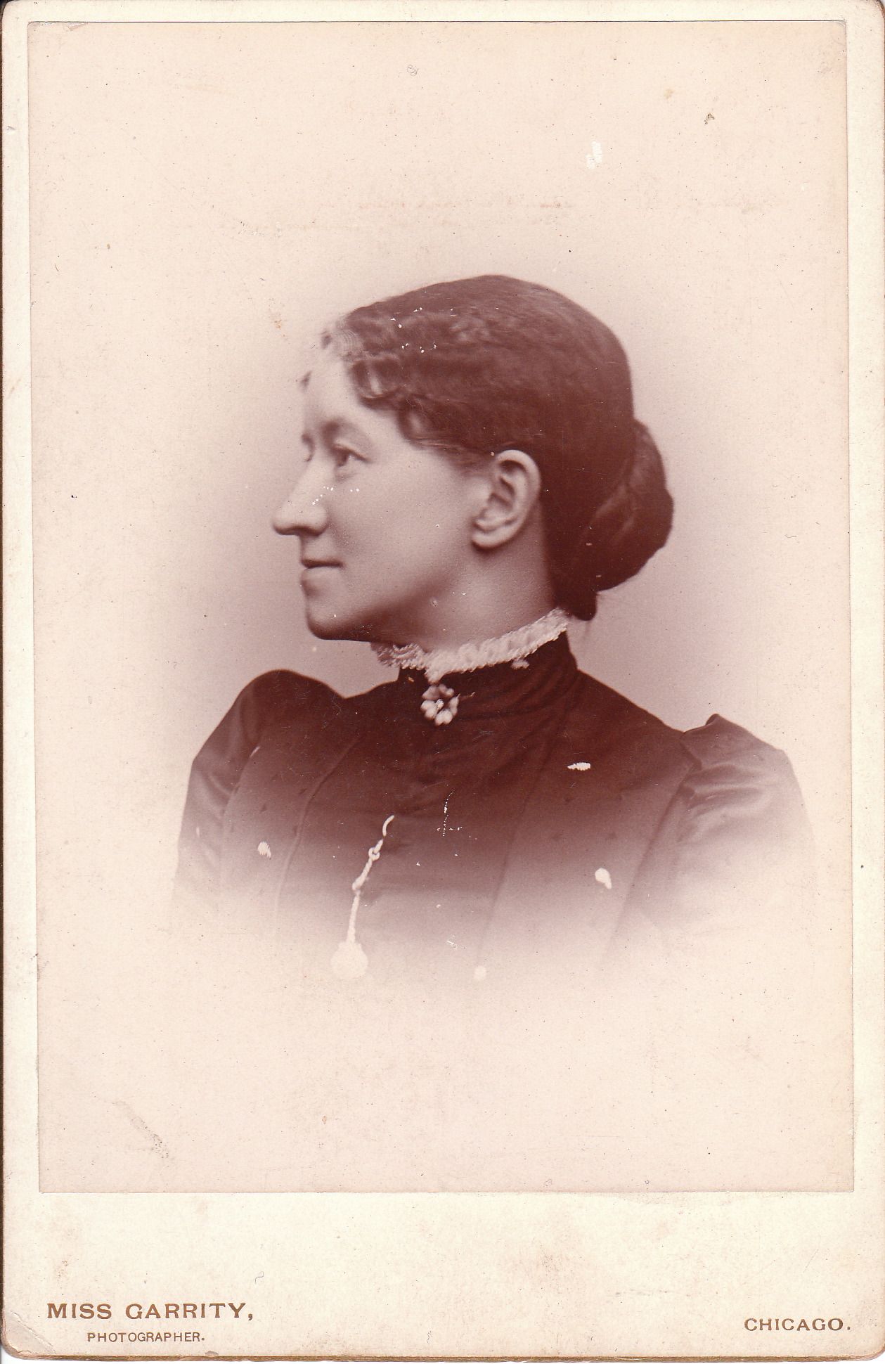 This cabinet card is a very ordinary profile portrait of a middle aged woman. She is nicely dressed in a high collar dress with lace trim. The only thing remarkable about this cabinet card is that the photographer, Miss Garrity, is a woman. Miss Garrity’s studio was located in Chicago, Illinois. To see other photographs by this photographer; click on the category “Photographer: Garrity”.