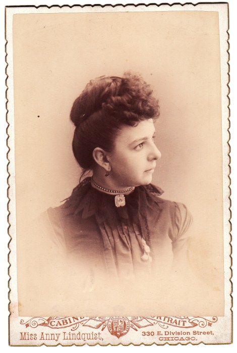 This cabinet card captures a profile portrait of a young woman wearing a necklace and pin (possibly a cameo) on her collar. The noteworthy feature of this cabinet card is that the photographer is a woman, Miss Anny Lindquist whose studio was located in Chicago, Illinois.