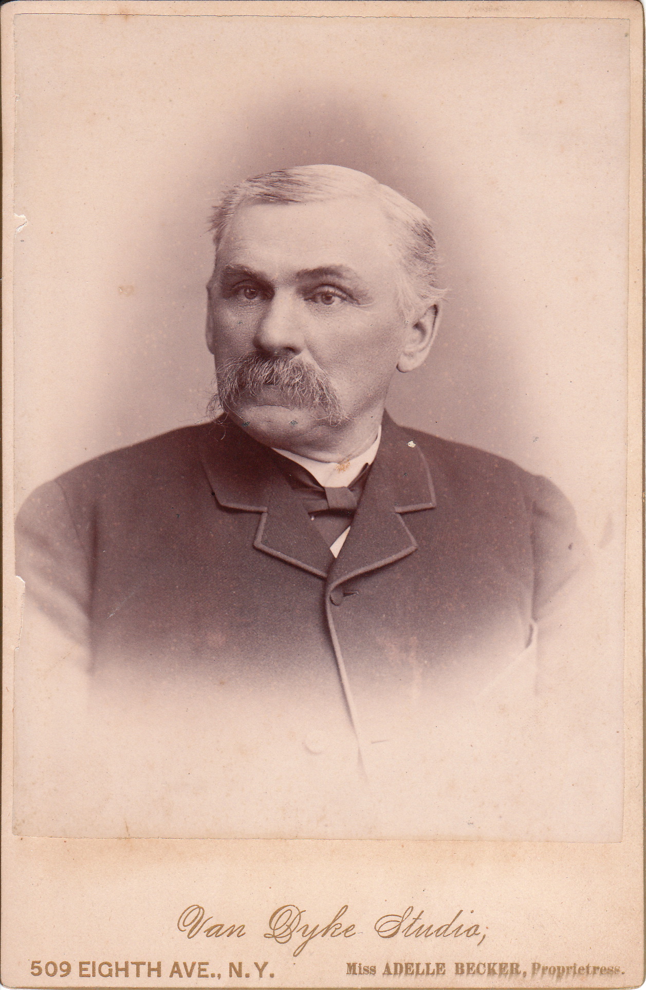 A older gentleman with a bushy mustache poses for his photograph at the Van Dyke Studio in New York City. Printing on the front of the cabinet card indicates that the owner and operator of the studio was Miss Adele Becker. A female owner of a photography studio was a bit unusual during the cabinet card era but the cabinet card gallery has developed a collection of cabinet cards produced by female photographers. Click on the category “Female Photographers”. In regard to Miss Becker, research yielded little information about her life or career. It is likely she bought the studio from Mr. Van Dyke.