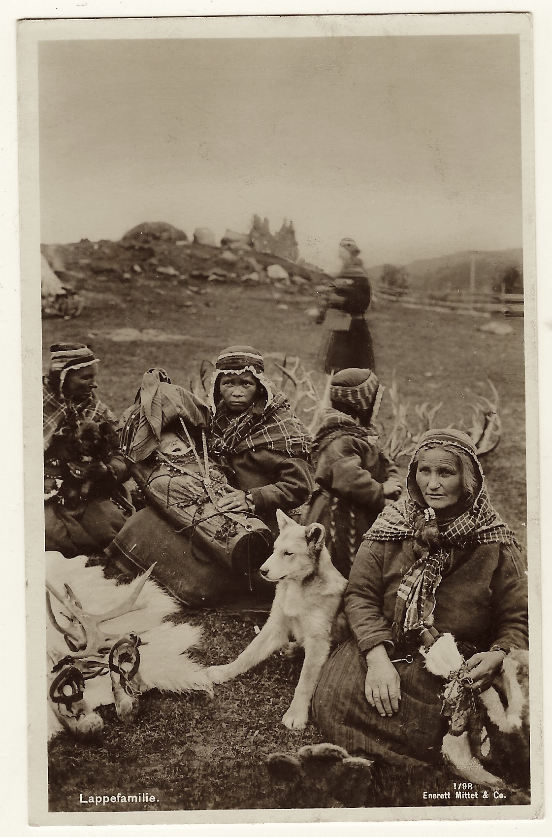 This vintage real photo postcard falls into the ethnographic category. This interesting image features a family in Lapland. The area of Lapland is located in Finland’s northernmost region. It is sparsely populated and is the homeland of the indigenous Sami people. The Sami’s pursue coastal fishing, fur trapping, and sheep herding. However, they are most known for their work as semi-nomadic reindeer herders. The reindeer are utilized for meat, fur, and transportation. The family seen in this photograph is part of the Sami people. There is much to note in this photograph. Take a look at the family’s clothing. Perusing the picture one can also see the family dog, animal skins, reindeer antlers and fur covered shoes. Be sure not to miss viewing the baby in a papoose like bed. This postcard was published by Enerett Mittet & Company and is part of a series (no. 1/98). The residue on the back side of this vintage postcard reveals that it once was a resident of a photo album.