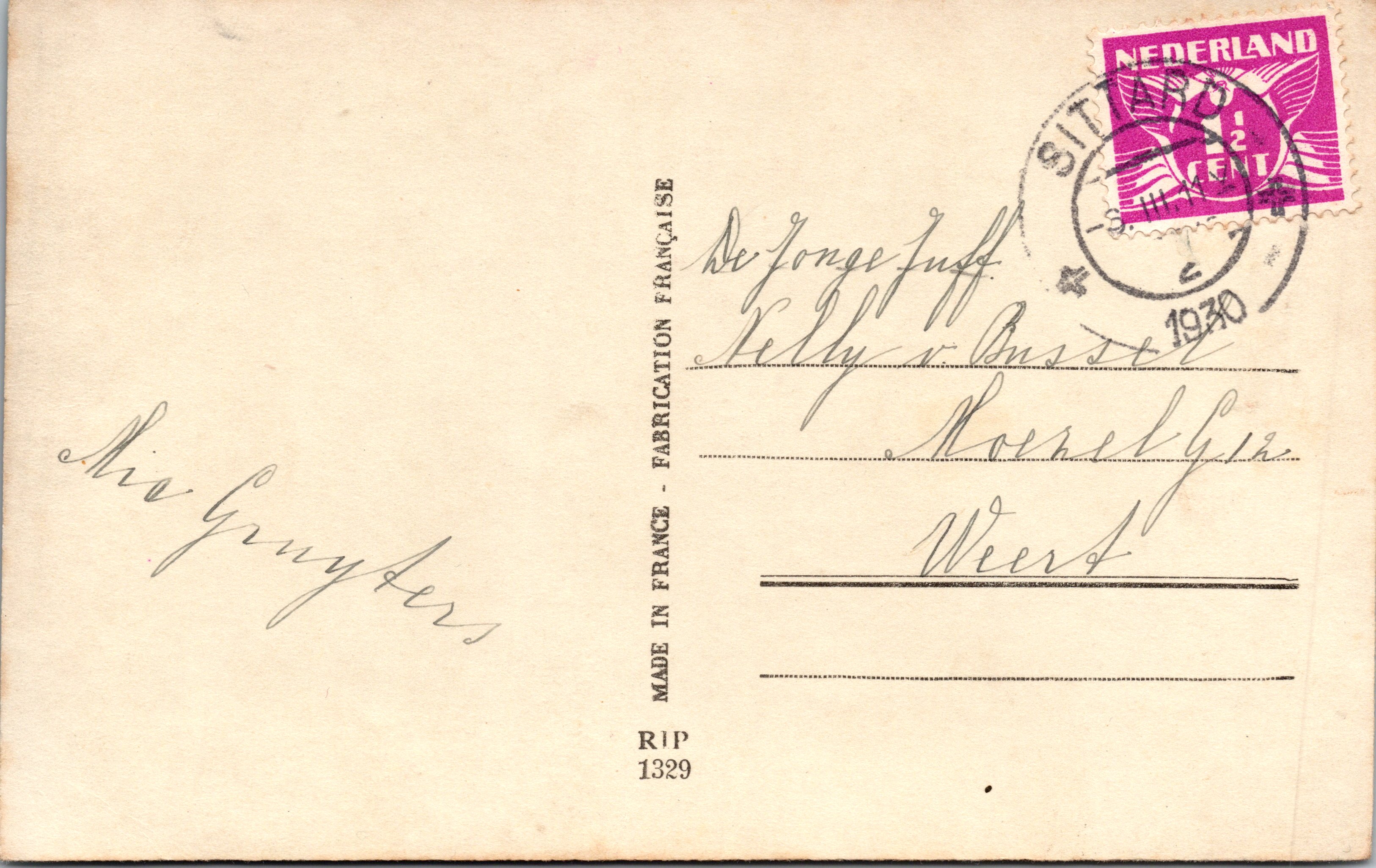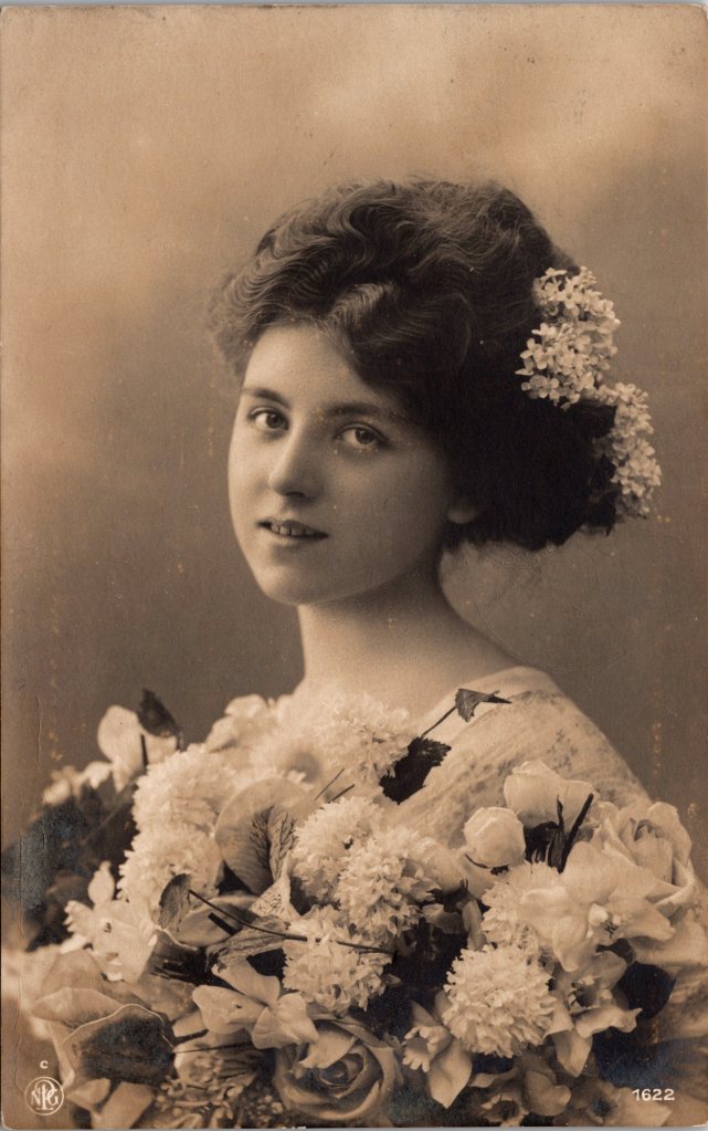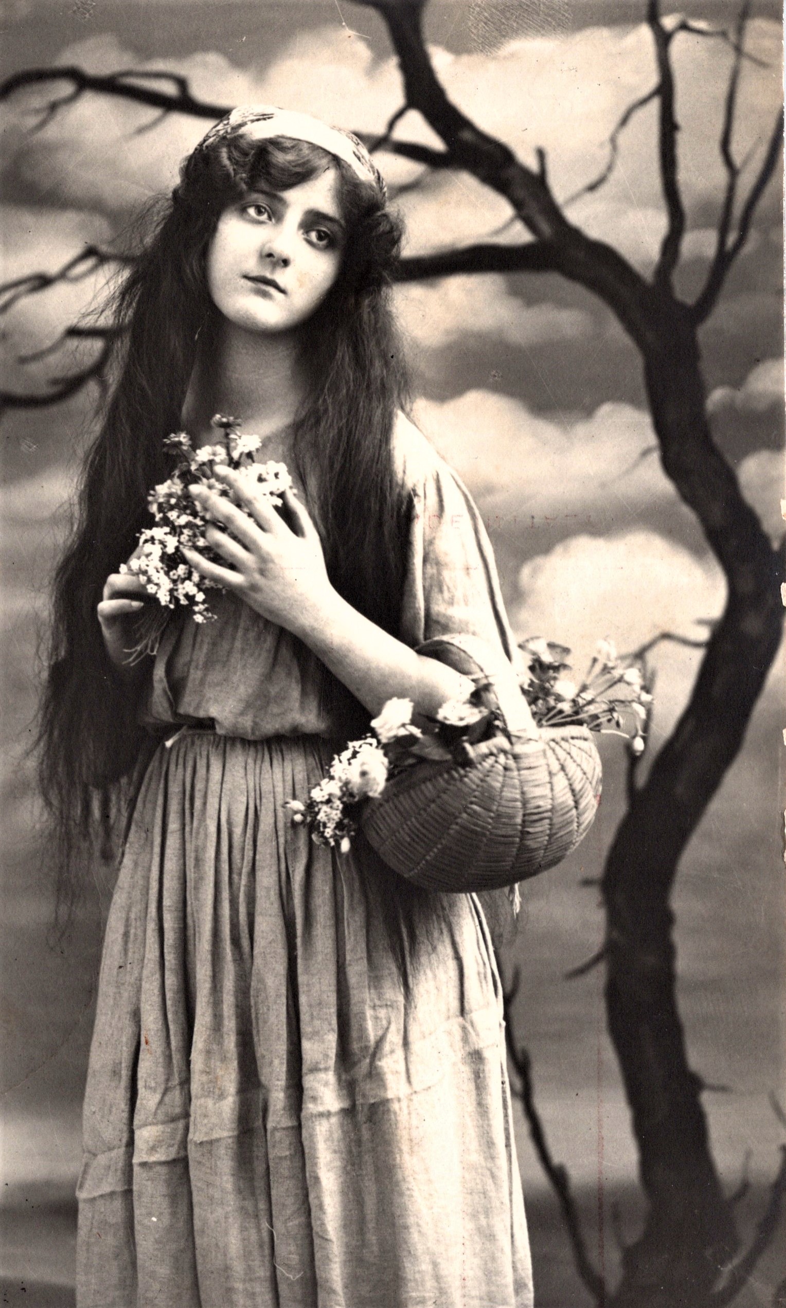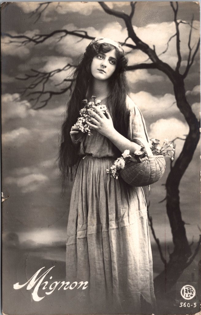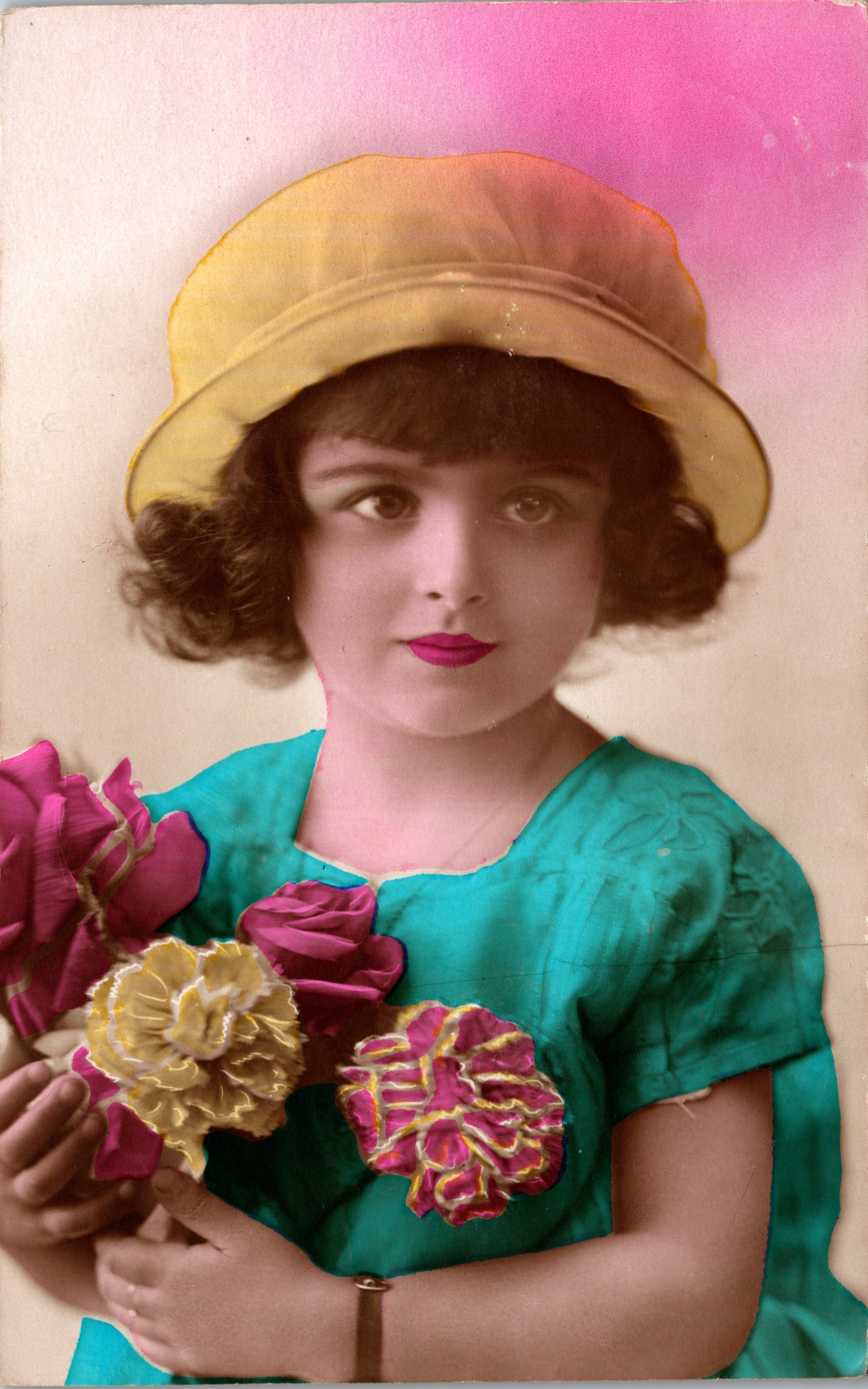 This color tinted vintage real photo postcard features a barefoot adorable little girl and her white cat that she is carrying in a cloth bag. She is also carrying a bouquet of flowers and has a basket on her back. The model seen in this postcard photo is most likely, Hani Reinwald, sister of popular postcard model, Grete Reinwald. Both girls became stage and film actresses. I own another postcard from the same series as this postcard. That postcard is postmarked 1913, indicating that this postcard also dates back to that year. This French postcard was published by Fauvette as part of a series (No.1319). SOLD