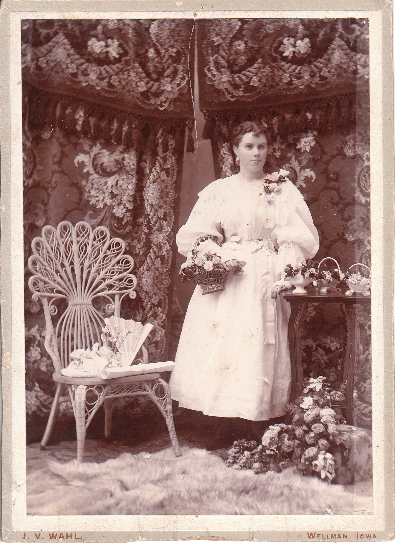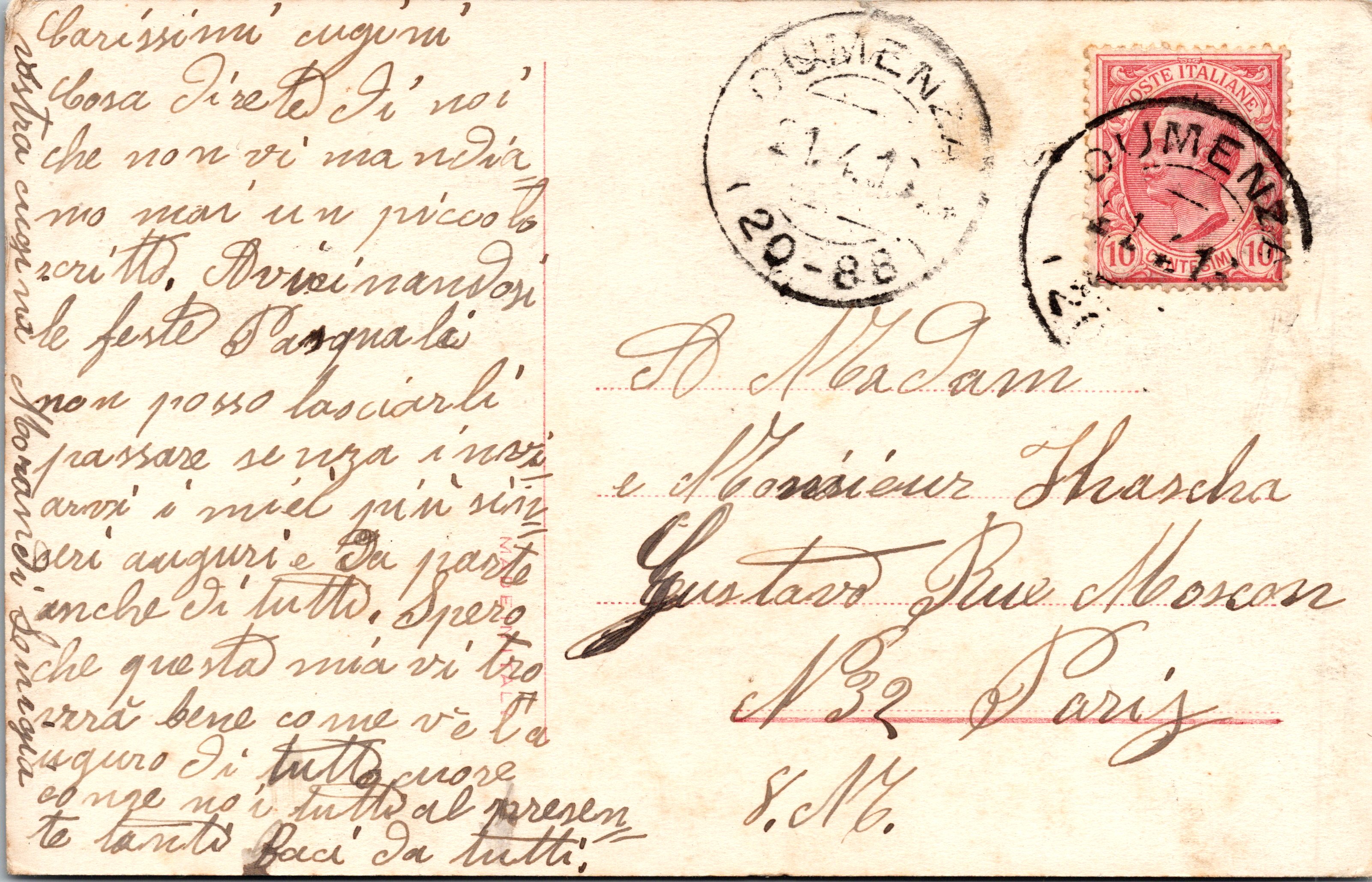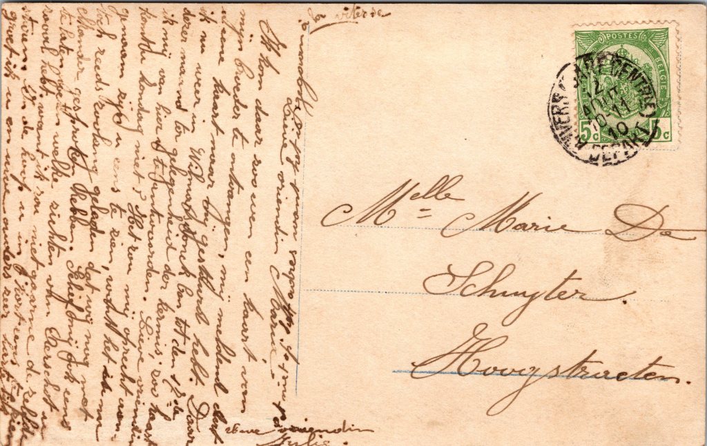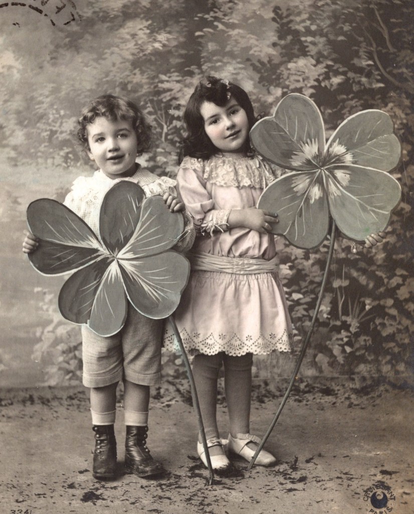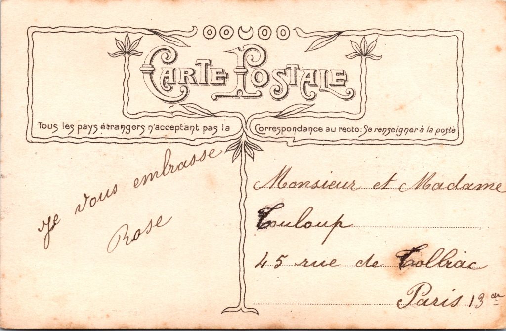 This color tinted vintage real photo postcard features a barefoot adorable little girl and her white cat that she is carrying in a cloth bag. She is also carrying a bouquet of flowers and has a basket on her back. The model seen in this postcard photo is most likely, Hani Reinwald, sister of popular postcard model, Grete Reinwald. Both girls became stage and film actresses. I own another postcard from the same series as this postcard. That postcard is postmarked 1913, indicating that this postcard also dates back to that year. This French postcard was published by Fauvette as part of a series (No.1319). SOLD