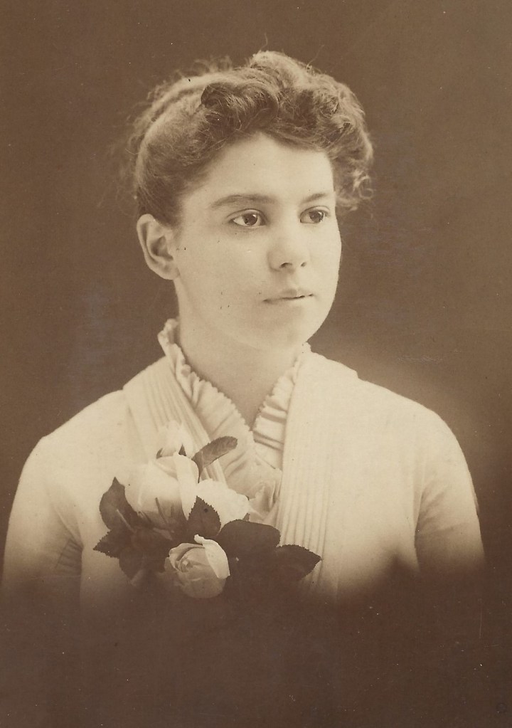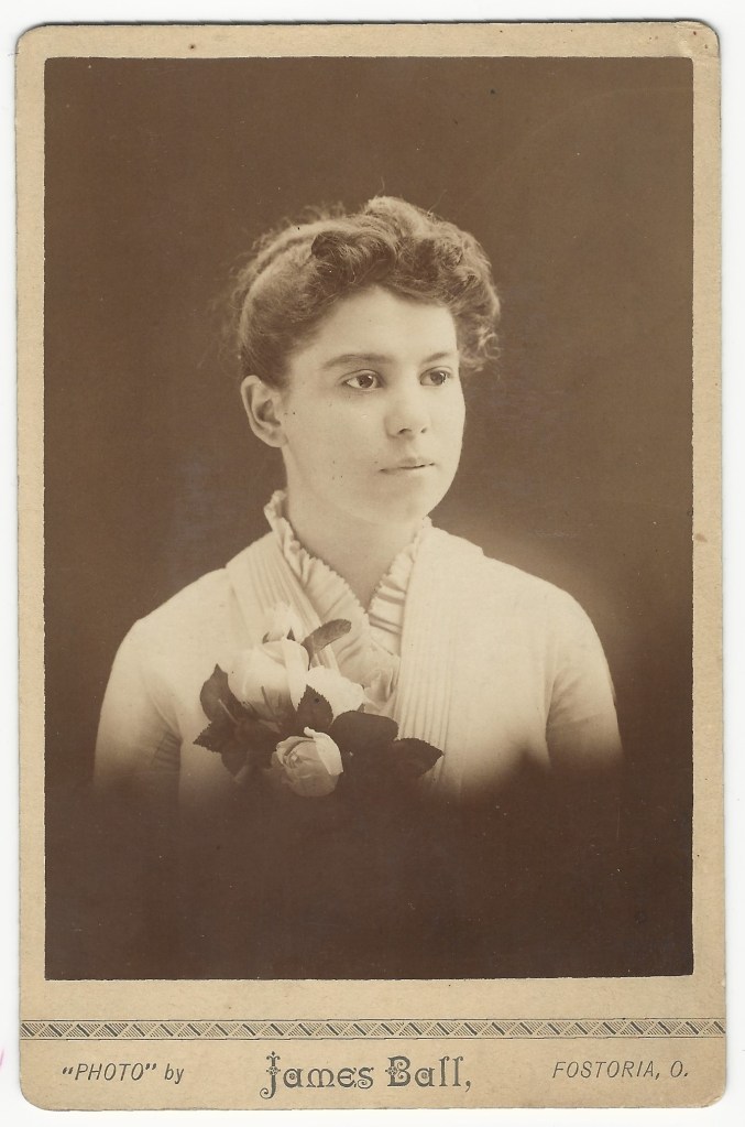 This cabinet card features a portrait of a pretty young woman with luminous eyes. She is wearing a rose corsage and a serious expression. Note the photographer’s expert use of light in this photograph. This portrait was taken at the studio of James Ball. He operated his photography business in Fostoria, Ohio. The city of Fostoria is located in the northwestern part of the state. The town was created in 1854. During the end of the nineteenth century, at the time that this photo was taken; the city was the home of over a dozen glass factories. The glass factories concentrated there because of the discovery of natural gas in the area and the easy access to the many railroads that ran through the town. The photographer of this image, James Ball , was born in Ohio in 1843 or 1844. Ball married his wife, Anna, in 1875. He was an active Fostoria photographer between at least 1880 until at least 1903. Ball died in Fostoria, in 1905. This cabinet card portrait is in very good condition (see scans).