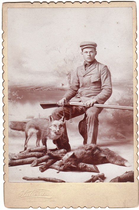 This vintage snapshot is highly unusual. A couple poses with two cute young foxes. The gentleman in the photo is holding the two fox pups on his lap. The woman is wearing pants and sitting on the automobiles side board. The old car is a nice backdrop, Note the man’s cool cap. This photograph measures about 2 3/8″ x 3 3/8″ and is in excellent condition.