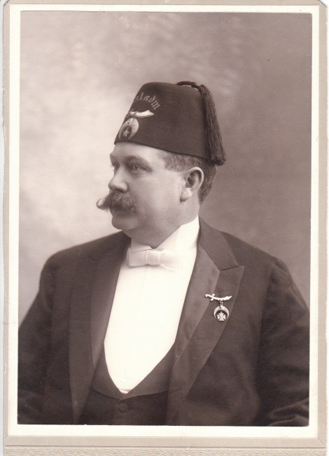 This photograph captures a fraternal organization member wearing an organizational hat and pin. Note the tassel on the hat and the man’s wonderful mustache. The hat has lettering on it which appears to say “Saladin”. The Saladin Shrine Center is located in Grand Rapids, Michigan. It was established in 1886 and has, like many such fraternal organization of that time, a Middle Eastern theme. Saladin was a warrior and Sultan of Egypt and Syria. He lived between 1138 and 1193. He was known for his soldiering, chivalry, courageousness, piety, acts of mercy, and kindness to the poor. The organization became very popular. By 1893, the fraternal group had 661 members. This photograph has been trimmed for framing and as a result, the name of the photographer and the location of his studio is unknown.