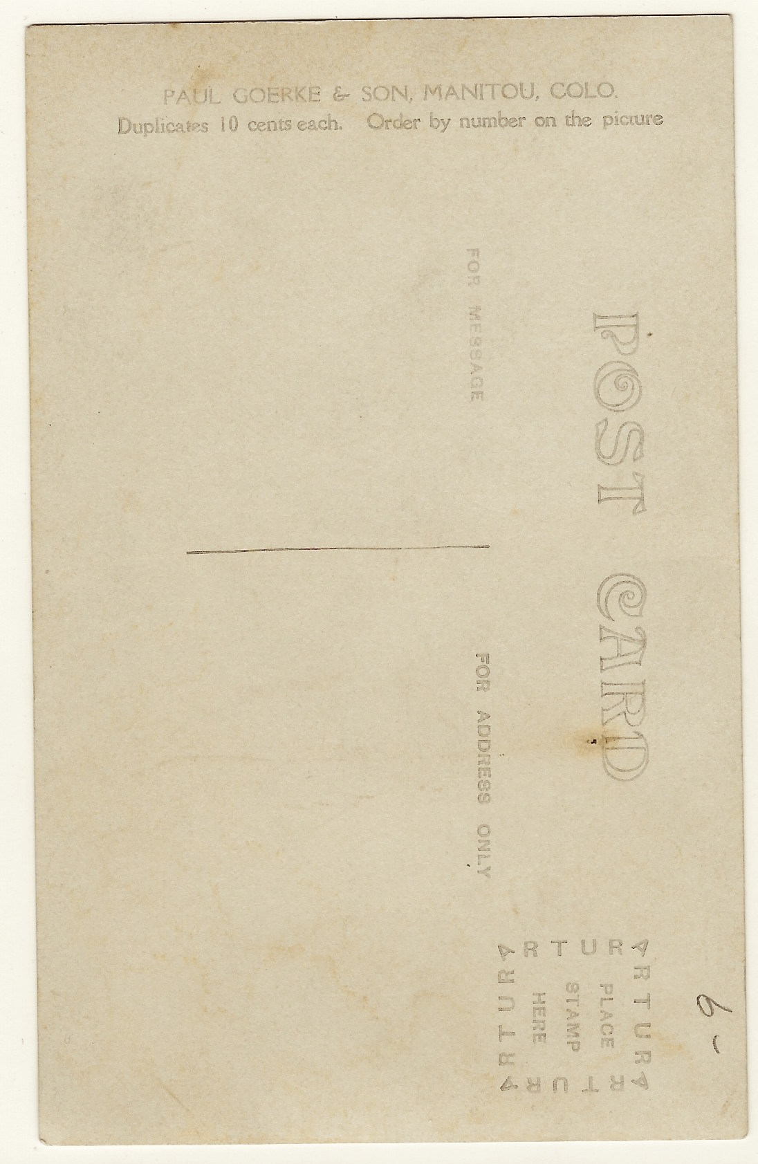 You’re looking at a charming early 20th-century real photo postcard taken at one of Colorado’s most iconic natural landmarks—Balanced Rock, located in the stunning Garden of the Gods park just outside Colorado Springs. This novelty photograph captures a group of five women posing proudly on donkeys in front of the massive, gravity-defying sandstone formation. The photograph radiates the playful spirit of early Western tourism. Five women sit astride small donkeys, all lined up neatly in front of the looming shadow of Balanced Rock. Their expressions vary from reserved amusement to open cheerfulness, suggesting they are enjoying a once-in-a-lifetime travel experience in the American West. Each woman wears a wide-brimmed sombrero-style hat, likely provided by the concession for a touch of “Wild West” flair. Their clothing is modest but stylish for the era—ankle-length skirts, blouses with sailor collars or lace trim, and fitted jackets give them a slightly adventurous, yet feminine look appropriate for tourists of the 1910s or early 1920s. Despite riding donkeys—often considered humble beasts of burden—the women’s confident postures and bemused smiles give the impression that they’re enjoying their frontier fantasy. Their donkeys stand calmly, reins held loosely in the women’s hands, adding to the relaxed, posed nature of the scene. The back of the card identifies the photographer as Paul Goerke & Son, who operated a thriving photography business in Manitou, Colorado. This firm set up a concession at Balanced Rock, one of the most photographed natural features in the West. Tourists could ride donkeys or burros up to the site, don hats, and pose for a souvenir photograph, which Goerke’s team would develop and print on postcard stock. (SOLD)