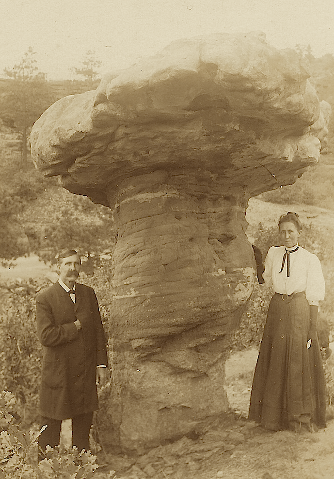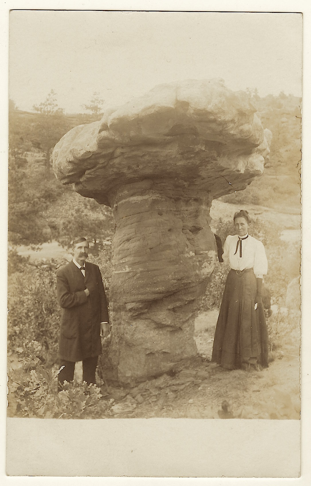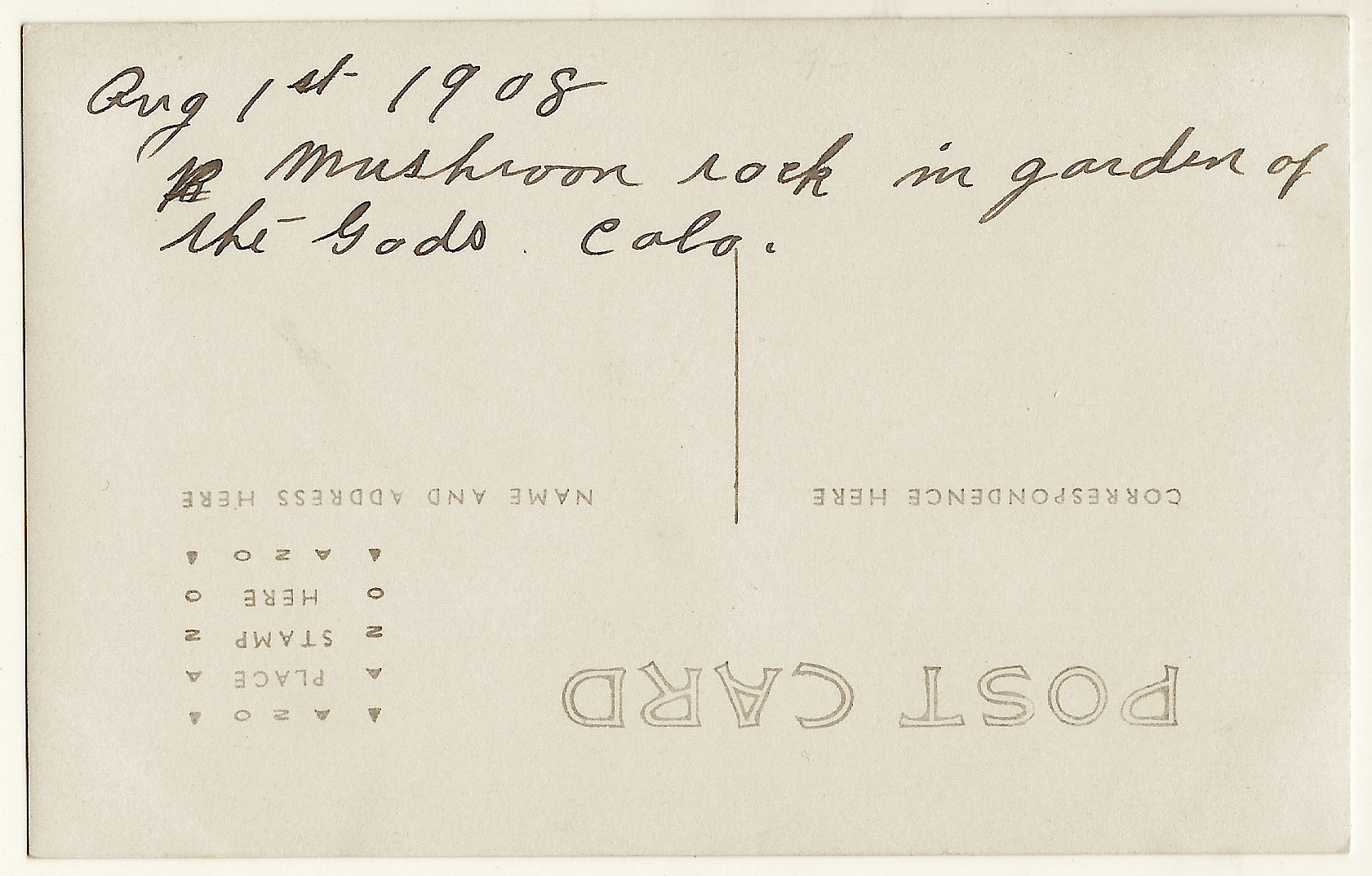 This 1908 real photo postcard captures a well dressed couple posing by “Mushroom Rock” which is located in the “Garden of the Gods” in the state of Colorado. The site is specifically situated in Colorado Springs. Garden of the Gods is a public park and was named a National Natural Landmark in 1971. Glaciers and erosion left the land with incredible rock formations. The park was named by two surveyors in 1859. Multiple Native American nations had involvement with the area. In addition to “Mushroom Rock”, tourists have made “Balanced Rock” a popular visitor site. A photograph of “Balanced Rock” can be found elsewhere in the Cabinet Card Gallery (use the search box to find it). The stamp box indicates the card was published between 1904 and 1918, The 1908 date written on the reverse of the postcard fall well within the range of those years. (SOLD)