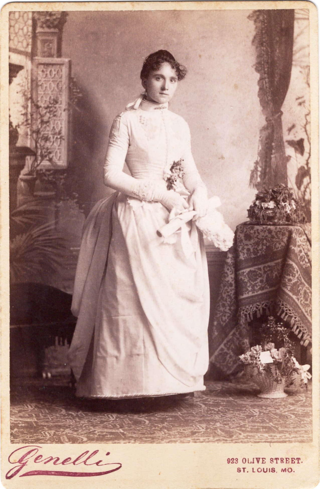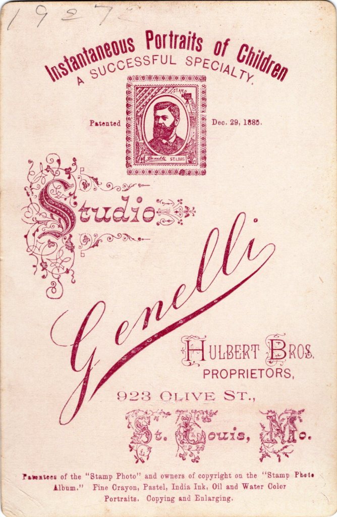 A pretty young woman appears in this portrait photograph from the Genelli studio in Sioux City, Iowa. She is wearing a lovely plaid dress with a corsage. The reverse of the cabinet card indicates that the proprietor of the studio was M. W. Starks. The book, History of the Counties of Woodbury and Plymouth Iowa (1890), reveals that M. W. Starks was born in Bradford, Illinois in 1851. In 1872 he began apprenticing as a photographer and soon entered a career in this field. In 1883 he came from St Louis, Missouri to Sioux City and established the Genelli gallery. In 1884 he married Miss Hattie L. Harvey. SOLD
