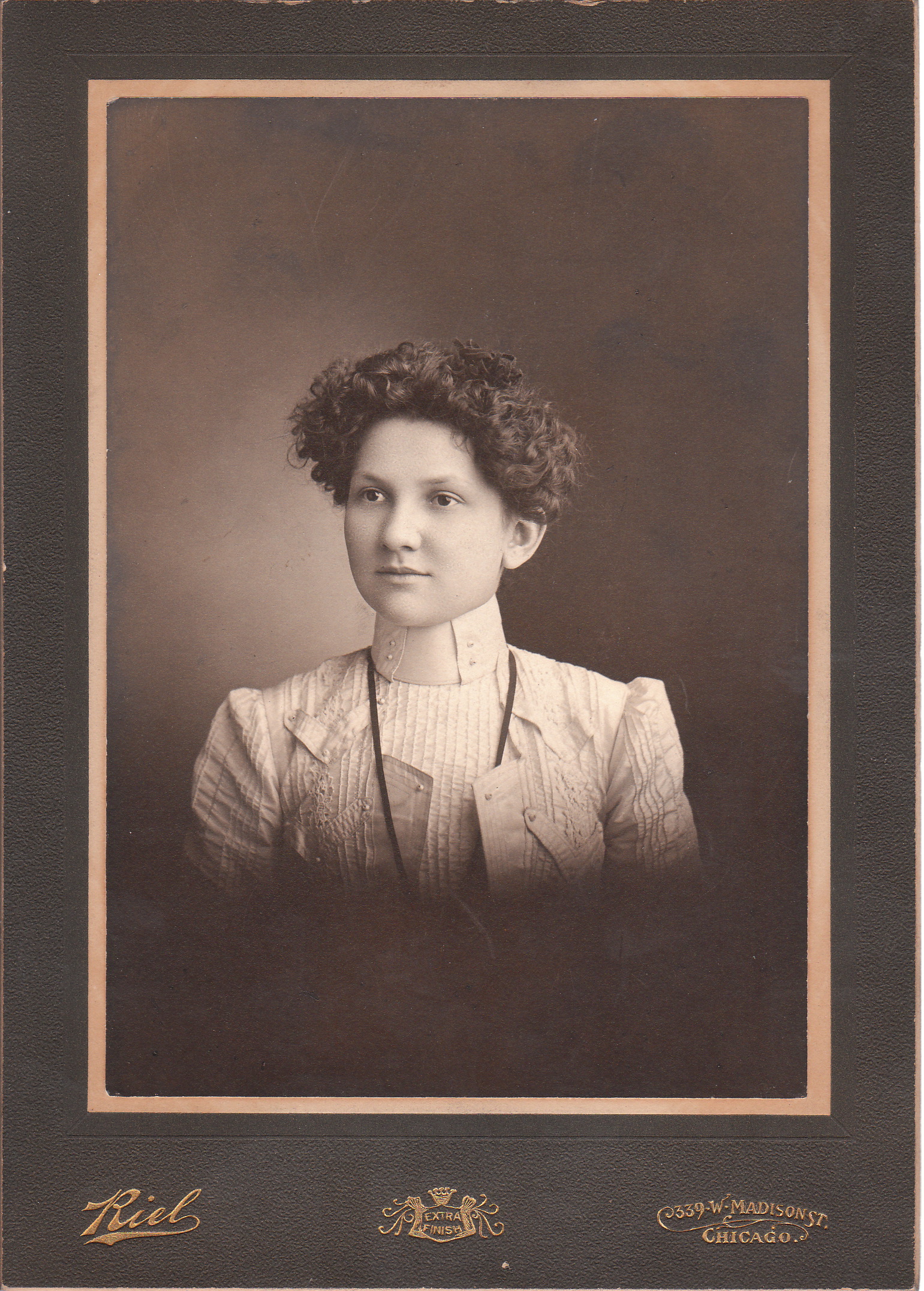 This vintage photograph features a portrait of a pretty young woman wearing a lace collar and lace bib. Note her collar pin and her lovely eyes. This photograph comes from the studio of George F. Riel of Chicago, Illinois. He was a talented photographer. You can make your own judgement about his talent by clicking on the category “Photographer: Riel”. You will be able to view more of his images and learn more about him.