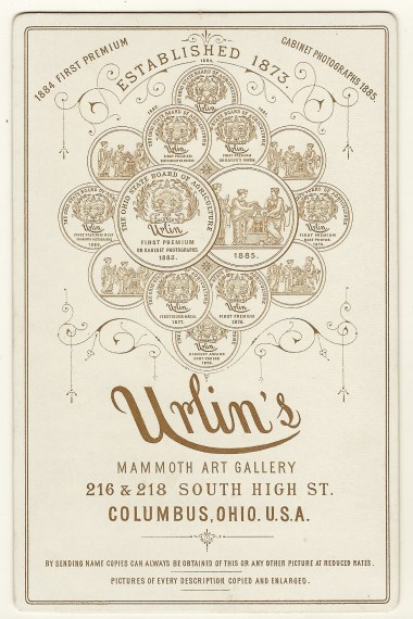 This cabinet card portrait features a dapper young man with a handlebar mustache. Unfortunately, the handlebar needs alignment; one tip points down, while the other seems to have fallen creating a tonsorial crisis. Note the width of the gentleman’s necktie.This photograph was taken by Urlin & Pfeifer’s Mammoth Art Palace in Columbus, Ohio. Urlin and Pfeiffer are no strangers to the Cabinet Card Gallery. The gallery has photographs by Urlin and Pfeifer as individual gallery owners; as  well as multiple images taken during their partnership.  John A. Pfeifer (1859-1932) was active in the Columbus area from 1882 to at least 1913. For much of that time, he was partners with George C. Urlin (1854-1942). Urlin was active in Columbus between 1873 and 1887. The reverse of this cabinet card offers an interesting back stamp that highlights some of the medals the pair received for their photographic work. The latest date noted on these medals is 1887, which reveals that this cabinet card was photographed sometime during or after 1887. The advertising also notes that the firm was established in 1873.