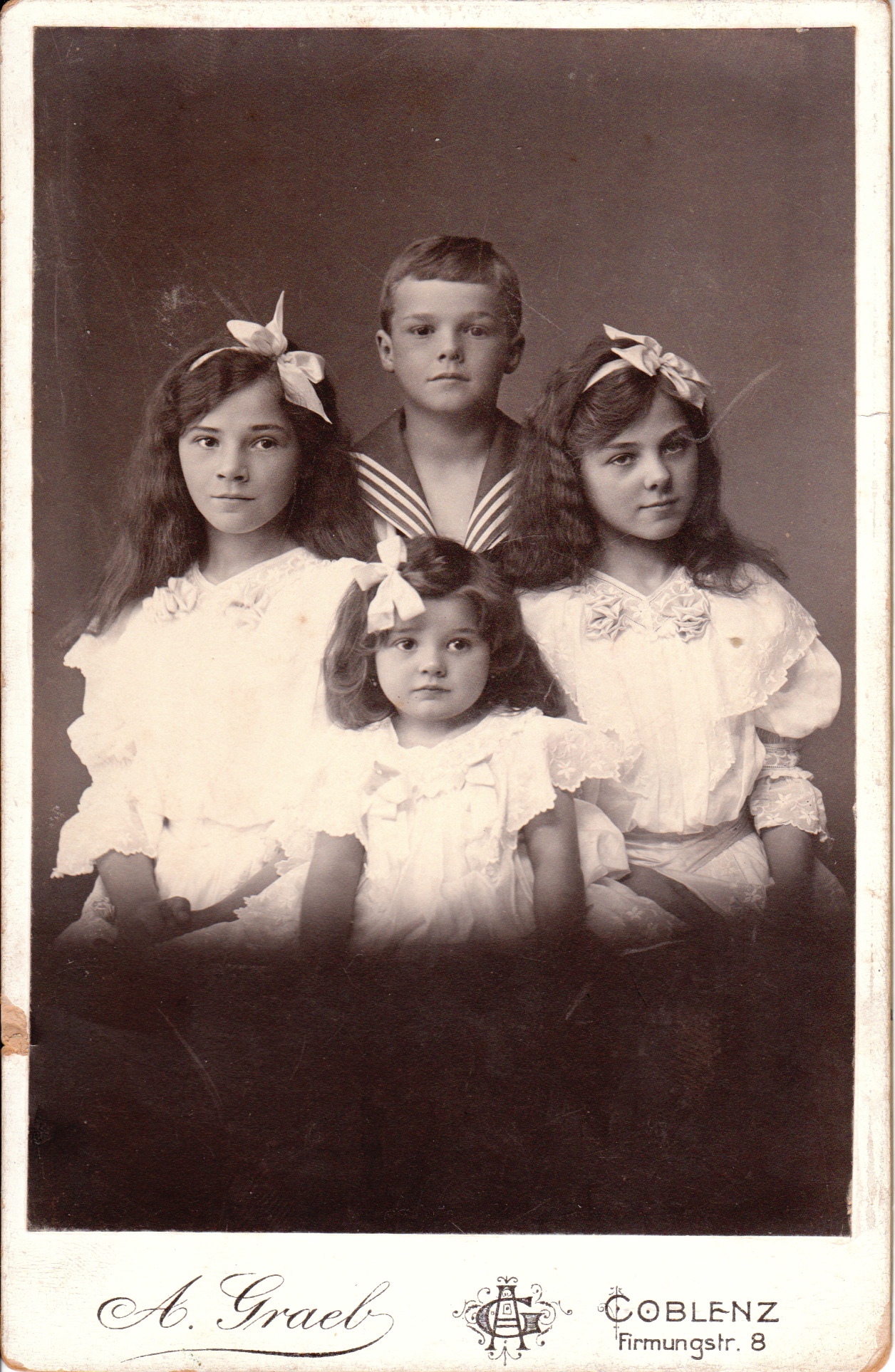 Four beautiful children pose for their portrait in Coblenz, Germany. It is likely that the children are siblings. The three girls are wearing bows in their pretty long hair. The boy is wearing a nautical outfit. The photograph is by A. Graeb of Coblenz, Germany. Coblenz is a city situated on both banks of the Rhine River. (SOLD)