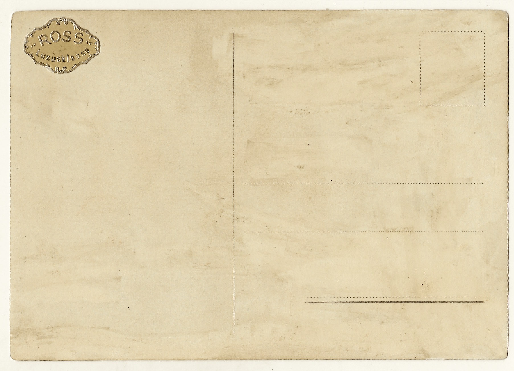 Postcard 1 was published by Ross Verlag and is part of the Luxusklasse series (no. 614).It is easily identifiable by the gold emblem on the reverse of the card.The postcard is larger than regular sized postcards. This vintage postcard measures about 4″ x 5 3/4″ and is in very good condition. (SOLD)