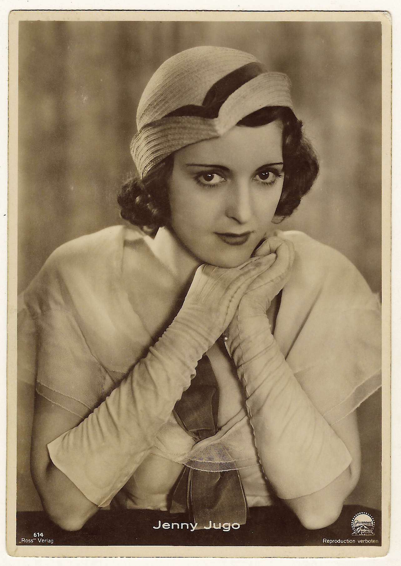 Jenny Jugo (1904-2001) was an Austrian actress. Her IMDb filmography reveals that she appeared in fifty-three films between 1925 and 1950. Jenny, as is evident in this vintage real photo postcard, was very beautiful. She was born in the Austro-Hungarian Empire. Her father owned a factory. She received her education in a convent. At age sixteen, she married actor Emo Jugo and the pair settled in Berlin, Germany. Their marriage was of short duration (1921-1922). She gave up her husband but not his last name. The German film studio, UFA, signed her to a contract in 1924. She struggled in the dramatic roles that she was given. By the end of the silent era, she was successful in comedies and specialized in that genre through the 1930’s. She often played perky, confident characters. She was often directed by Erich Engel. In 1935, Jugo played Eliza Doolittle in Pygmalion. Writer, George Bernard Shaw was so happy with her performance that he invited her to act in all of his plays on the English stage. She made films during the Nazi regime until 1943, when she returned to her Bavarian home. She was in a relationship with film producer Eberhard Klagmann who worked on her final three post-war films. In 1950, she married actor and former co-star, Friedrich Benfer. She retired from acting at age forty-six. She was given a lifetime achievement award for her outstanding contribution to German cinema. The IMDb biography of Jugo describes her as a “lively brunet, dimple-cheeked actress with a tom-boyish, unaffected manner”. The writer of the biography contends that Jenny Jugo flirted with stardom but did not achieve it. This assessment may be too harsh. To view Jenny Jugo acting in a 1931 film, watch the youtube video below.