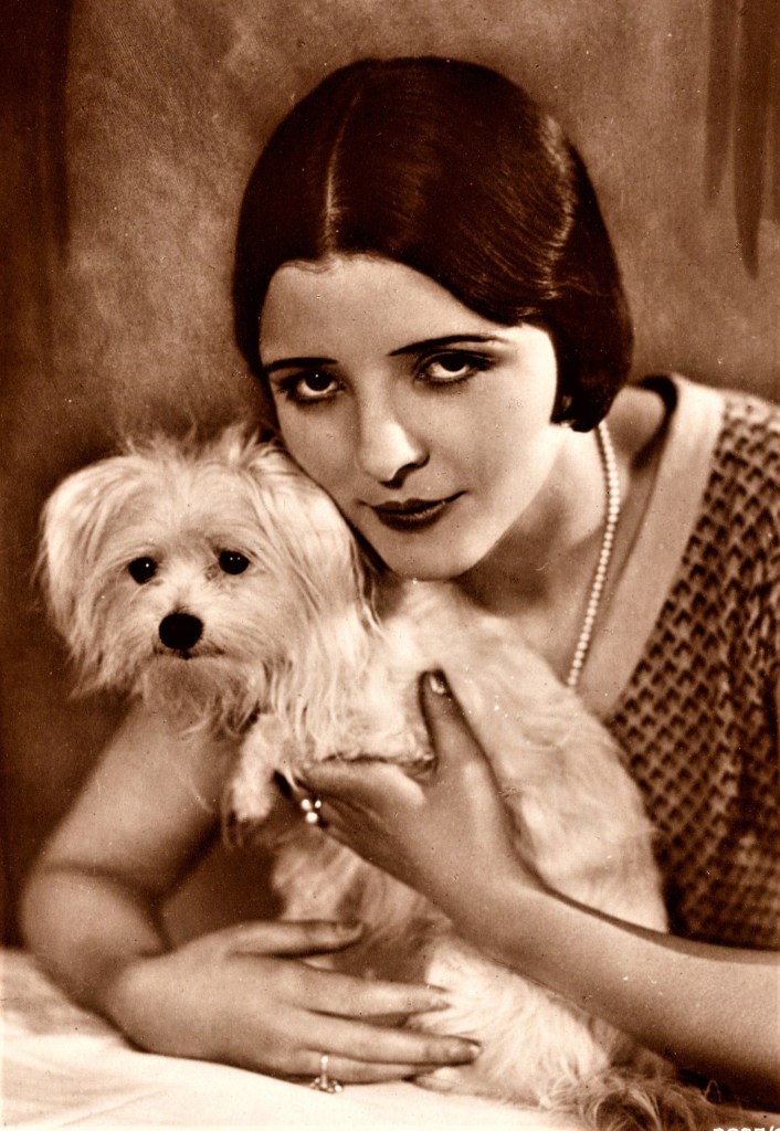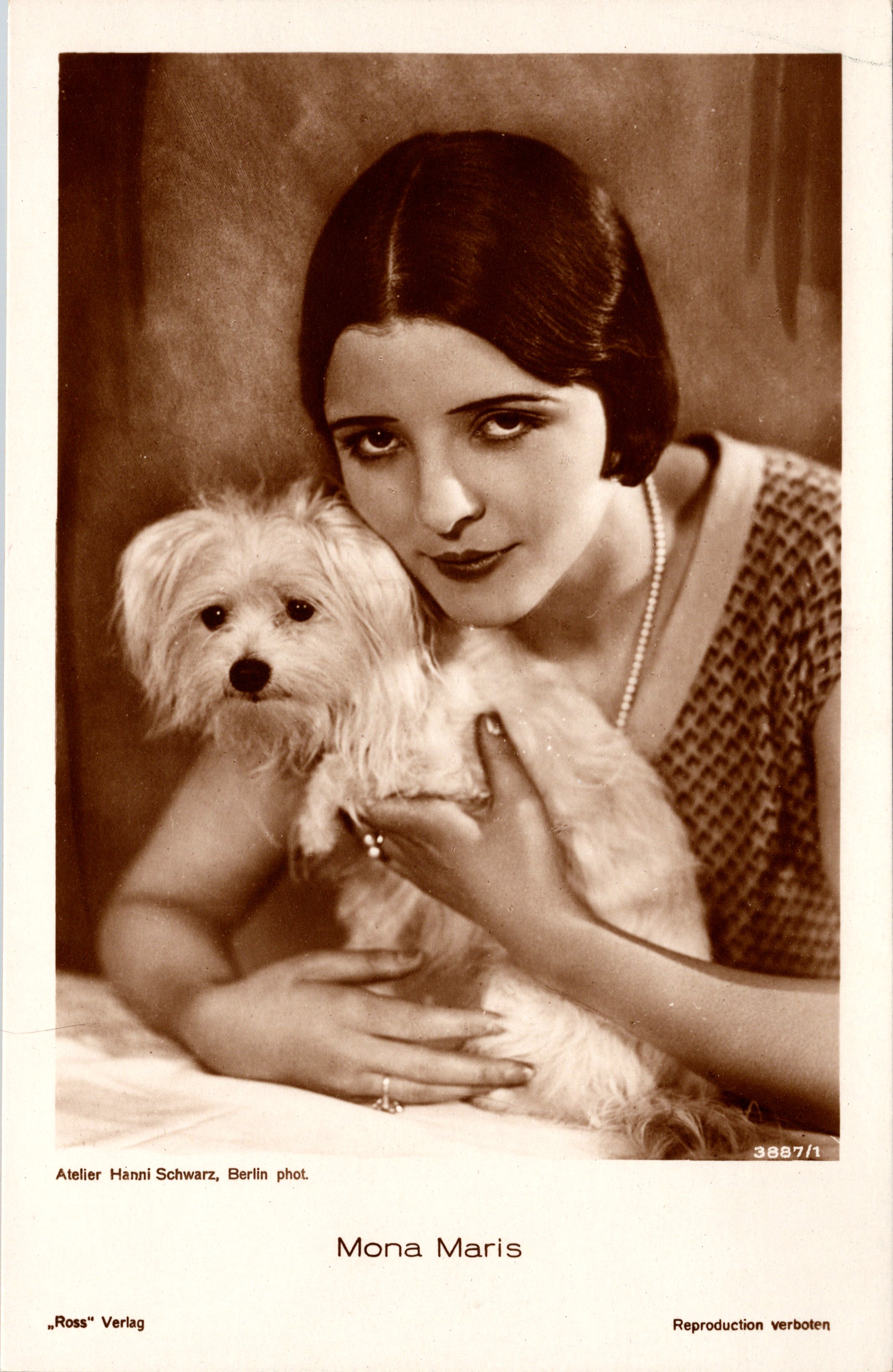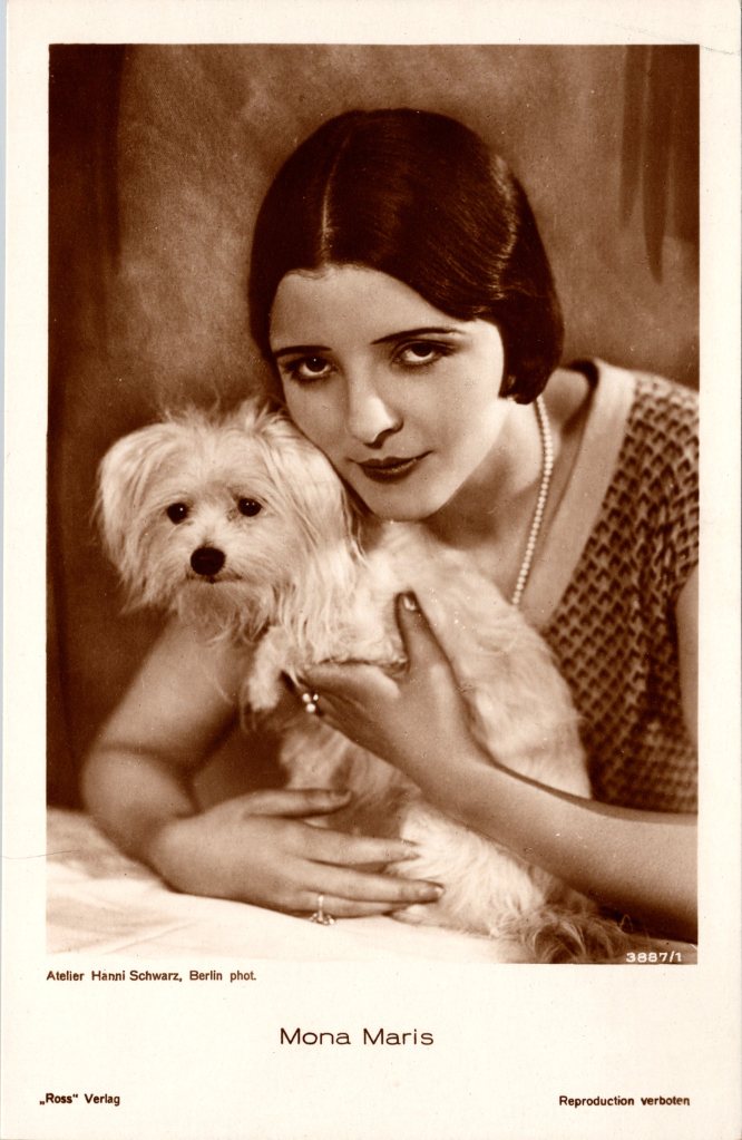 This uncommon vintage real photo postcard features actress Mona Maris (1903-1991). The postcard was published by Ross Verlag (No.3887/1). The photograph is from the Hanni Schwarz studio. Schwarz was a German female photographer and her work was praised in “American Photography” (1909). She was a well known professional photographer in Germany during the early 1900’s. She is thought to have worked until the 1930’s. The subject of this photo, Mona Maris was born in Argentina. Her mother was Spanish Basque and her father was French Catalan. At the early age of four, Mona was orphaned. She grew up with her grandmother in France where she was educated in a convent as well as in Germany and England. At age 19, she spoke four languages. It was during World War I that Mona decided to be an actress. While she was in school in France, she and her classmates wrote, directed and acted in plays to entertain nearby troops. Upon graduation, she went to England to live, where she stayed two and a half years. She was introduced to the President of the United Film Association by the Argentinian ambassador to Germany. She was signed to a five year contract by Germany’s Universum Film AG productions. She began her film career in either 1924 or 1925. After just four films in Germany, she began a Hollywood career in United Artists “The Apache” (1925). Despite knowing multiple languages, the onset of sound films created a problem. Her English was described as “almost unintelligible”. Between 1931 and 1941, she starred in 19 Spanish language versions of successful American films. The movies were produced by Fox Films. She has been described as “sultry” and “sleepy eyed”. The IMDb credits her with 53 film roles between 1925 and 1984. Mona was married twice and had no children. She died and was buried in Buenos Aires, Argentina. This vintage postcard features Mona Maris posing with an adorable smoll dog. Maris is very pretty. Note her eyes. They have been compared to Bette Davis’s eyes. (SOLD)