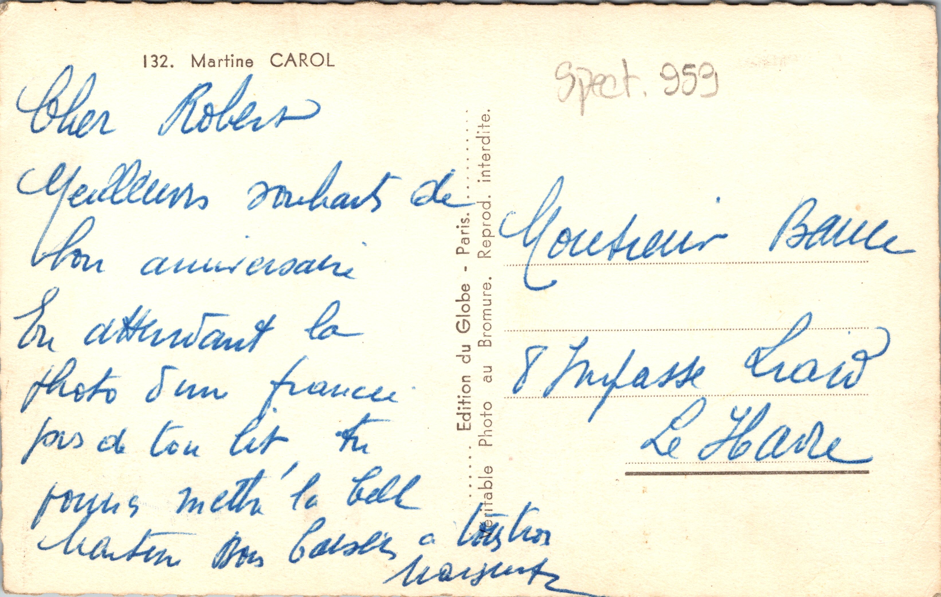 Anne Vernon (1924- ) was a French theatre, television and film actress. She is seen in this vintage real photo postcard, posing with a Dachshund dog. Vernon began her film career in the late 1940s, gaining attention for her elegance, charm, and natural screen presence. Her first notable role was in The Murdered Model (1948), marking her debut during the French occupation. In the post-war years, she became a prominent figure in French cinema, appearing in a variety of genres, including comedies, dramas, and musicals. One of her most significant roles came in Jacques Demy’s The Umbrellas of Cherbourg (1964), where she played Madame Emery, the mother of Catherine Deneuve’s character. Her nuanced performance brought depth to the bittersweet romance of the film, which remains a classic of French cinema. Throughout the 1950s and 1960s, Anne worked with esteemed directors such as René Clair and Julien Duvivier, further solidifying her reputation as a versatile actress. She also appeared in international productions, making her a recognized figure beyond France. Notably, she appeared in the Hollywood film Shakedown (1950), playing the role of Nita Palmer alongside Howard Duff and Peggy Dow. This was her only Hollywood film. Despite this venture into American cinema, she remained less known in the United States compared to her prominence in Europe. Over her career, Anne Vernon appeared in approximately 40 films between 1948 and 1970. Anne Vernon was married three times. Her husbands included French lawyer and politician Robert Badinter and politician Jean-Pierre Prouteau. As of January 2025, Anne Vernon is still alive. She is 101 years-old. Miss Vernon’s photograph seen on this postcard was taken by Lucienne Chevert (1911-1982). She was a Paris based photographer who photographed dozens of French film stars post World War II. She was the partner of the well known celebrity photographer, Sam Levin.