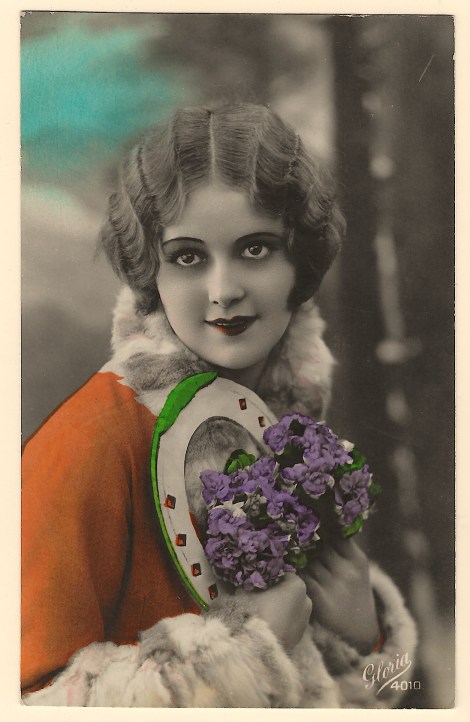This vintage real photo postcard features a very attractive young woman holding a bouquet of purple flowers and what appears to be a horseshoe. The woman is beautifully dressed in an orange winter coat with a fur collar and fur sleeve cuffs. She has a wonderful smile. The postcard is from the French art deco period. It was likely published in the 1910’s. The postcard was published by Gloria and was part of a series (no. 4010). The horseshoe seen in this photograph is an enigma. First of all, is it a horseshoe? It is way too large to be anything but a piece of art, rather than a real horseshoe. Horseshoes have long been associated as being “lucky”. They were originally made of iron, a metal that was believed to ward off evil spirits. They were originally held in place with seven nails. Seven was considered a lucky number. Superstitious sailors believed a horseshoe nailed to a mast would keep storms away from their ship. This postcard is in excellent condition (see scans).