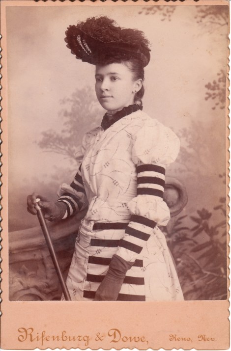 This Cabinet Card captures a pretty young Black woman posing at the studio of Rifenburg and Dowe in Reno, Nevada. The woman is beautifully dressed and the details of her elaborate dress are easily seen in the closeness and clarity of this image. Note the woman’s dark gloves and that she appears to be holding a cane, or perhaps, a parasol.