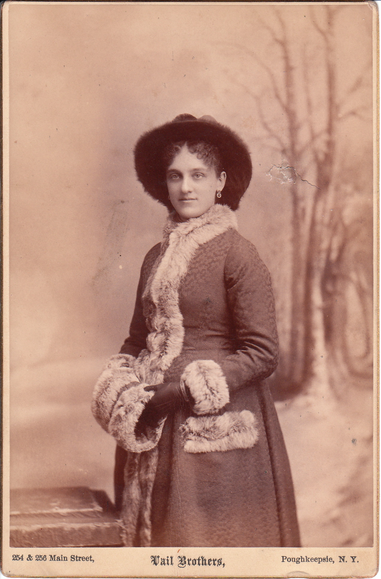 This cabinet card is a portrait of a pretty young woman dressed in winter clothing. Her heavy coat is trimmed with fur and she appears to be wearing a fur hat and leather gloves. The woman can access additional warmth from her fur muff. She is clearly ready for a cold New York winter. The photographic studio that produced this image is Vail Brothers, of Poughkeepsie, New York. Vassar College library’s archive possesses two photographic albums from the photographers. The collection includes photographs of Vassar and Poughkeepsie. Vail Brothers began their studio in 1868 and it was still in existence at least until 1895. The studio is also known for their photographs of a number of the members of the Roosevelt family, including Franklin Roosevelt during his childhood years.
