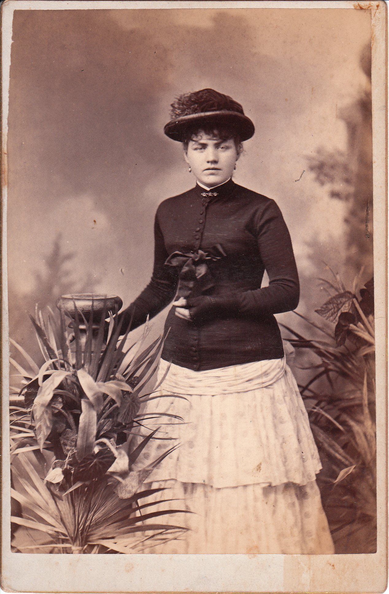 A pretty woman stands among some plants at the photographic studio of Patten, Perkins and Stratton in Boston, Massachusetts. The studio was located at 47 Hanover Street in Boston. The woman is wearing a pretty hat and a large bow on her blouse. She is wearing a pattern dress and a collar pin. Note the woman’s fingerless gloves.