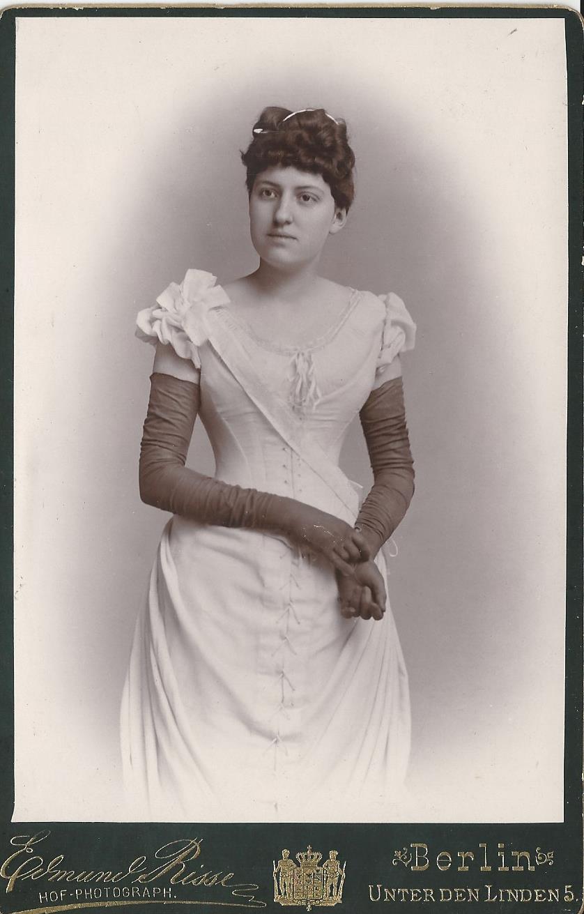 This cabinet card features a very pretty sexy young woman wearing a beautiful formal dress. She is clearly wearing a corset as evidenced by her lovely figure. What makes this portrait noteworthy is her long dark gloves. They are so long that they reach her upper arms. This beautiful portrait was taken by Edmund Risse who operated a studio in Berlin, Germany. Risse was an talented early European photographer. A letter about technical photography issues and signed by Risse appears in The British Journal of Photography (1883). SOLD