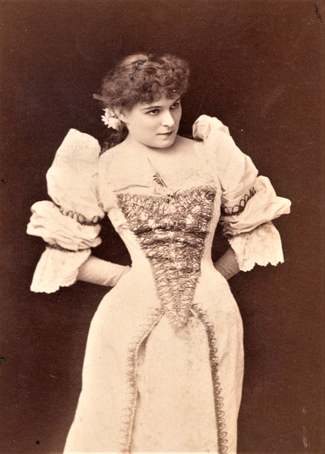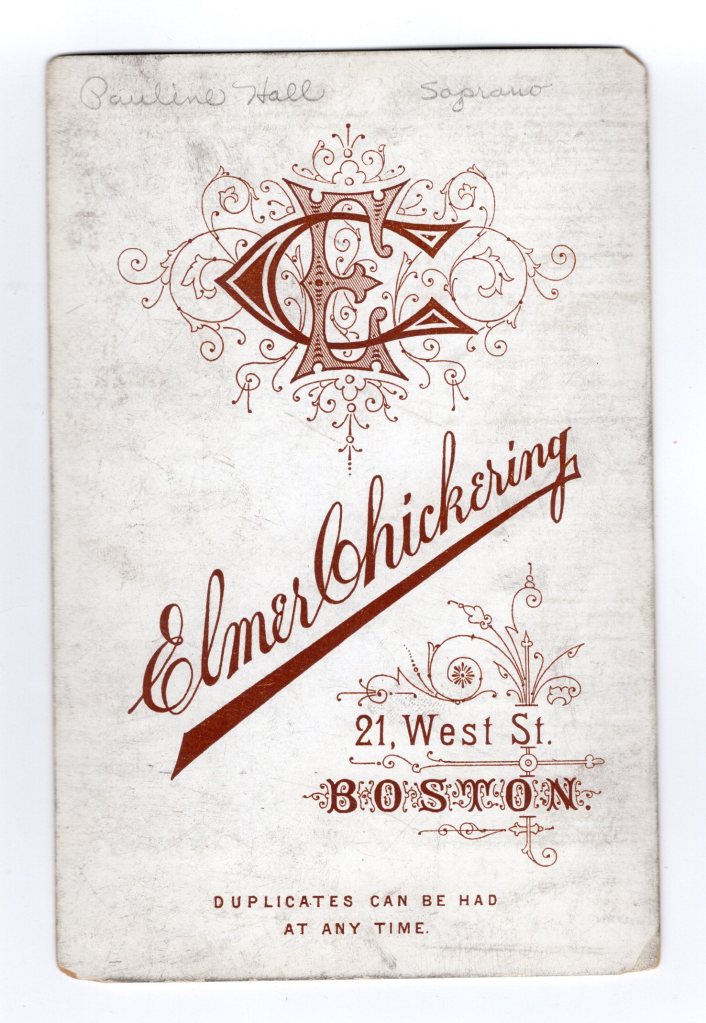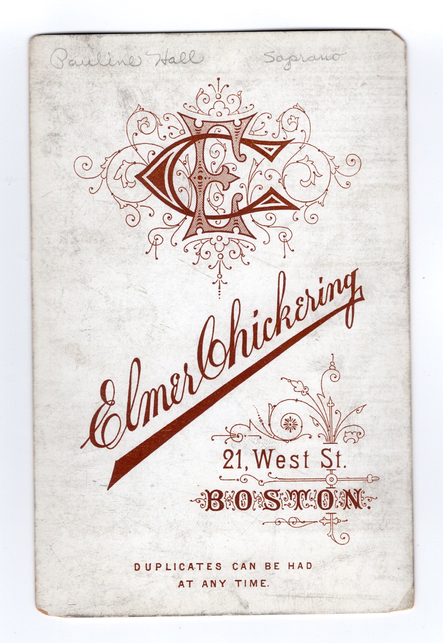 This cabinet card features Pauline Hall (1860-1919), one of the most popular turn of the century prima donnas. She began her career as a dancer in Cincinnati, Ohio at age 15. She joined the Alice Oats Opera Company but left to tour in plays with famed actress Mary Anderson. By 1880, she worked for well known producer Edward Everett Rice in musical productions. Early in their association, he gave her a role in “Evangeline”. Her shapely figure allowed her to take male roles as she did in “Ixion” (1885). Her greatest success came in the title role of the first American production of “Erminie” (1886). She played in more than two dozen Broadway operettas. Her final role was in the “Gold Diggers” (1919). This photograph was taken by famed celebrity photographer, Elmer Chickering of Boston, Massachusetts. The cabinet card has wear in it’s lower right hand corner and has a very slight curl. It is in overall good condition *see scans.