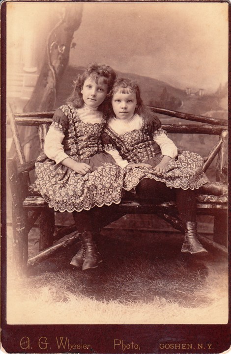 These Goshen girls are likely sisters, and they are wearing identical exquisite dresses as they pose for photographer A. G. Wheeler, in Goshen, New York. Wheeler is mentioned in the book,The Empire State: Its Industries and Wealth (1888). He is described as a native New Yorker who established his Goshen gallery in 1885. The brief biographical sketch adds that, earlier in time, he had a photographic studio in Hempstead, New York.