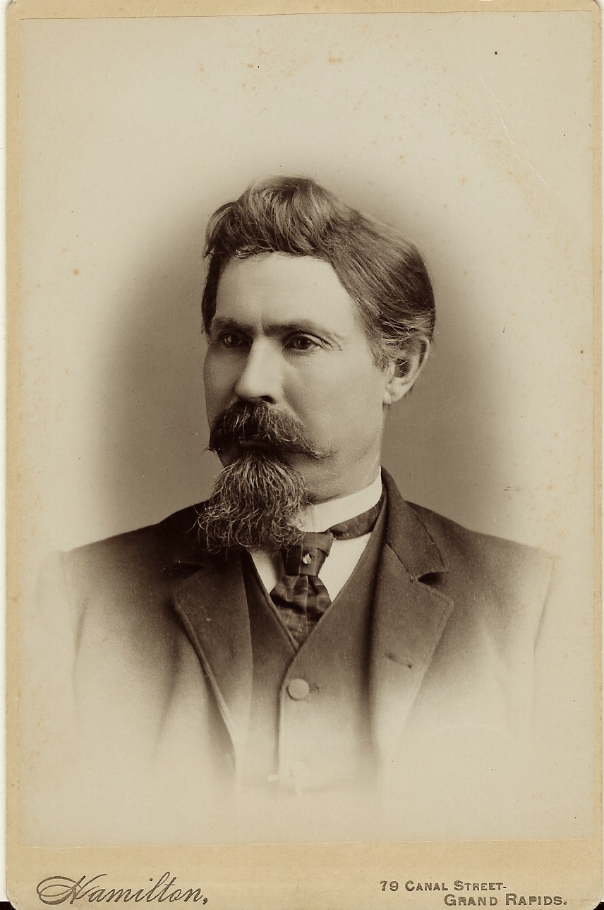 This cabinet card portrait features a well dressed handsome gentleman with a stylish mustache and beard. Men were more creative with their facial hairstyles during the cabinet card era compared to today. This gentleman’s mustache is incredibly thick and he is wearing his beard in a fashion that might be called “the billy goat” look. To view other interesting beards, click on the category “Beards (Only the Best). This photograph was taken by the Hamilton studio in Grand Rapids, Michigan. The Hamilton studio was located in Grand Rapids between 1886 and 1911. The studio was run by Daniel H. Hamilton (1836-1891) and his wife, Emma J. Hamilton (1852-1918). Daniel Hamilton was born in New York while his wife was born in Iowa. Their studio was at times single proprietor and at times run by a partnership. Daniel ran the studio between 1886 and 1896. Emma ran the studio between 1897 and 1907 and then again between 1909 and 1910. There were two partnerships in the studio’s history; Hamilton & Vancampen (1908) and Hamilton & Reingholtz (1911). Emma is listed in the 1900 US census as living in Grand Rapids with a housekeeper and a servant. Both Daniel and Emma are buried in Oakhill Cemetery in Grand Rapids.