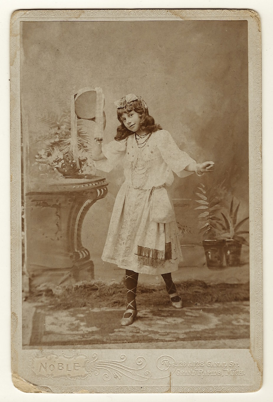 An adorable young girl wearing ballet shoes, poses for her portrait at the Noble Studio in Grand Rapids, Michigan. The photographer posed her as if she was dancing. The bright eyed young girl has a terrific smile. The photographer of this image is Thomas Frederick Noble (1866-1932) and he operated a photography studio at various addresses in Grand Rapids. His career spanned between 1890 and 1931. The 1920 US census found him living in Grand Rapids with his wife Pauline (age 50) and two of their children, Fred (age 17) and Pauline (age 15). The 1900 US census reveals that he also had a daughter named Lily. Noble died in 1932 and is buried in Graceland Memorial Park in Grand Rapids.