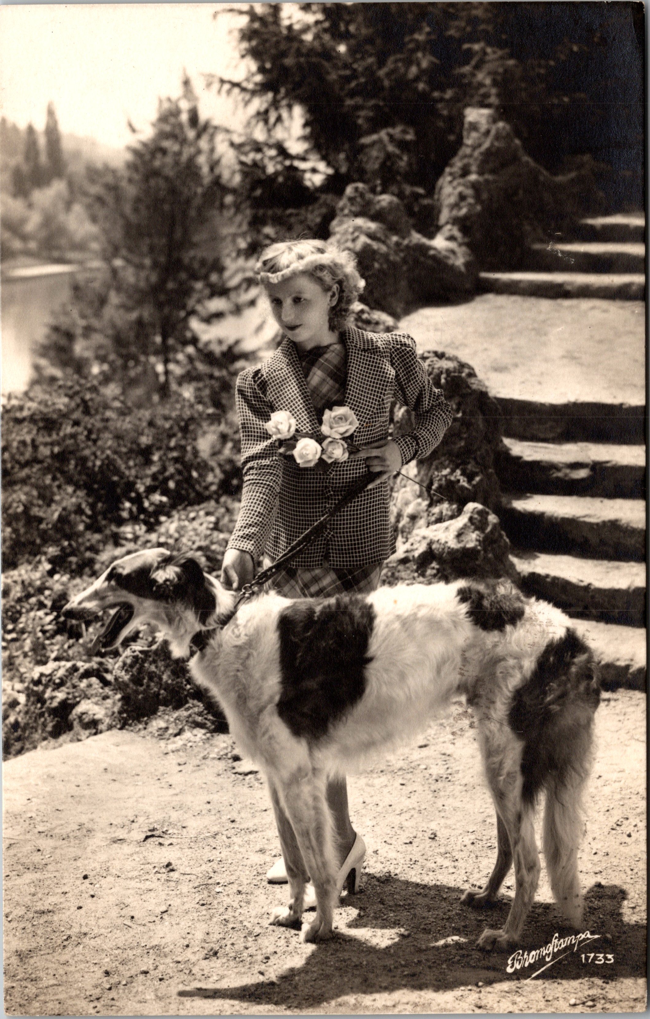This rare risque vintage real photo postcard features famous European dance partners, Edmonde Guy (1903-1951) and Ernst Van Duren (?-1930). The pair are flanked by three regal looking greyhounds. If you look closely, you will see the dogs are leashed. Edmonde Guy was a French dancer and film actress. She also was a model for paintings by Dutch artist, Kees Van Dongen. In 1921 she and Van Duren formed a dance partnership. They performed both in Europe and the United States. In 1926, they were hired by Florenz Ziegfeld for his “Palm Beach Follies”. Guy and Van Duren were famous for their daring outfits and erotic performances. Evidence of their “steamy” work can be seen via this postcard image. Guy is wearing a sheer top, but she is virtually topless. Not much is known about Van Duren. One newspaper reported that he was Hungarian but his family was originally from the Netherlands. Besides being a dancer, he also acted. His first film role was in a French silent film in 1923. He played minor roles in a few films but his break out role was in a circus film called “Manege” (1928). He then starred in a film with Edmonde Guy, with the title “Princesse Mandane” (1928). In 1930, Van Duren committed suicide. There were rumors his self destruction was caused by the end of his relationship with Edmonde. However, some writers believe his suicide was related to his relationship with American dancer, Jack Forrest. This French postcard was published by J.R.P.R. and the photographer of the two dancers was G. L. Manuel Bros. SOLD