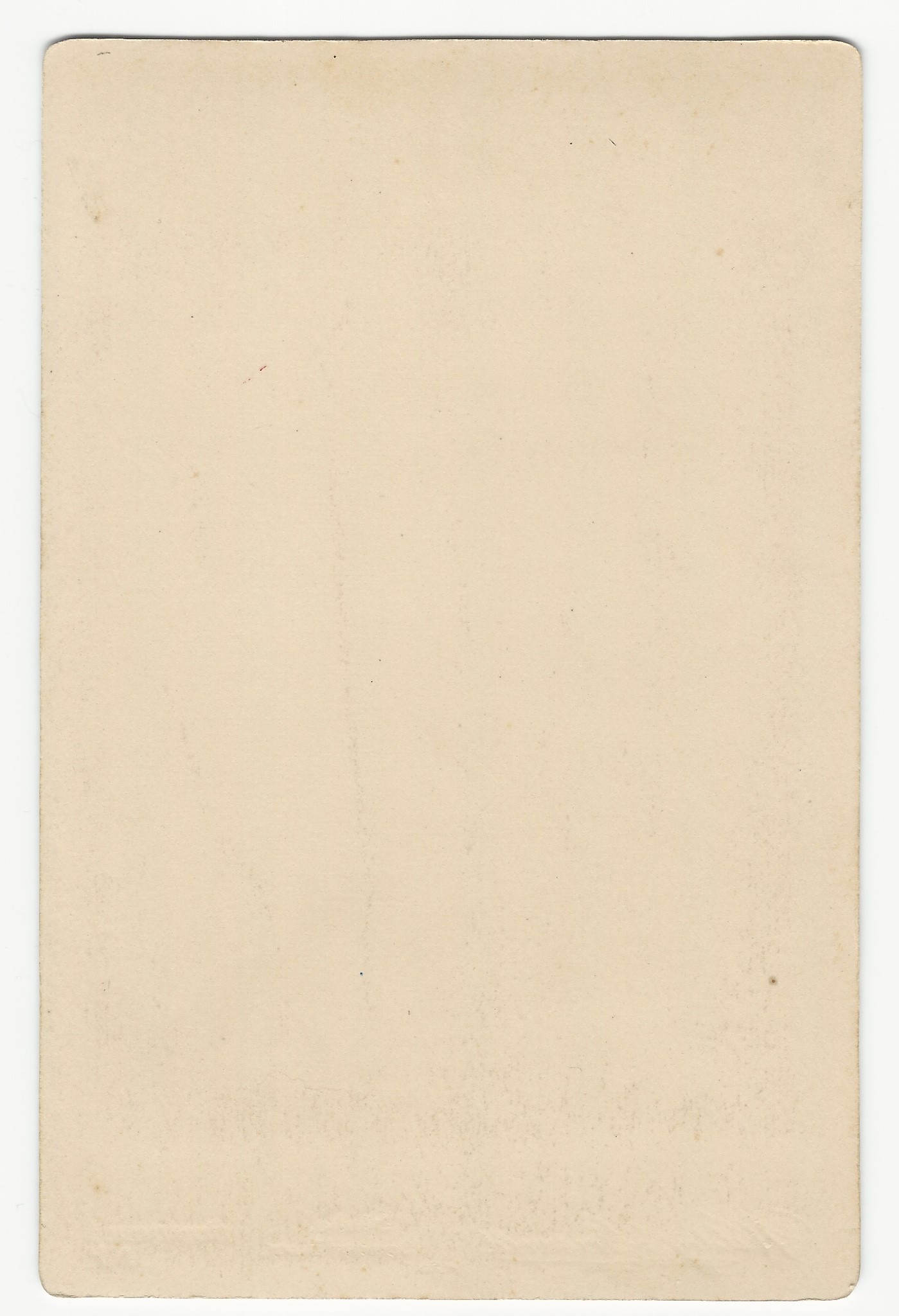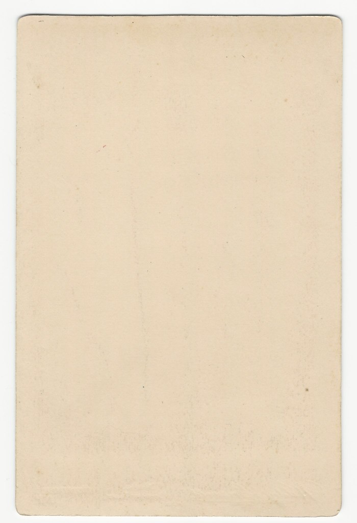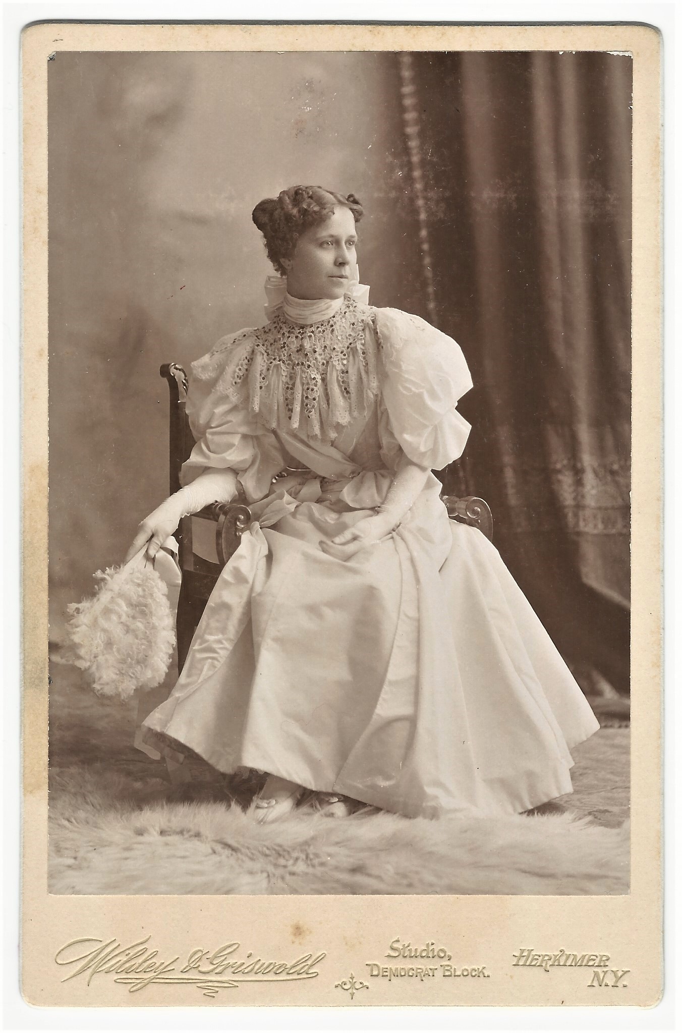 This cabinet card features a beautiful young woman posing for what is probably her wedding portrait. She is wearing a stunning white lace trimmed dress and is holding a white ostrich feather in her gloved hands. Note her big puff sleeves. This image was produced by the Willey & Griswold studio in Herkimer, New York. The studio was located on the “Democrat Block”. This is certainly an unusual name for a street. The area doesn’t sound like a particularly heterogeneous neighborhood. My hypothesis is that the street was named after a local newspaper, The Herkimer County Democrat which was published between 1856 and 1861. The newspaper company was likely located on the block, and as a major landmark, the street was named after it. SOLD