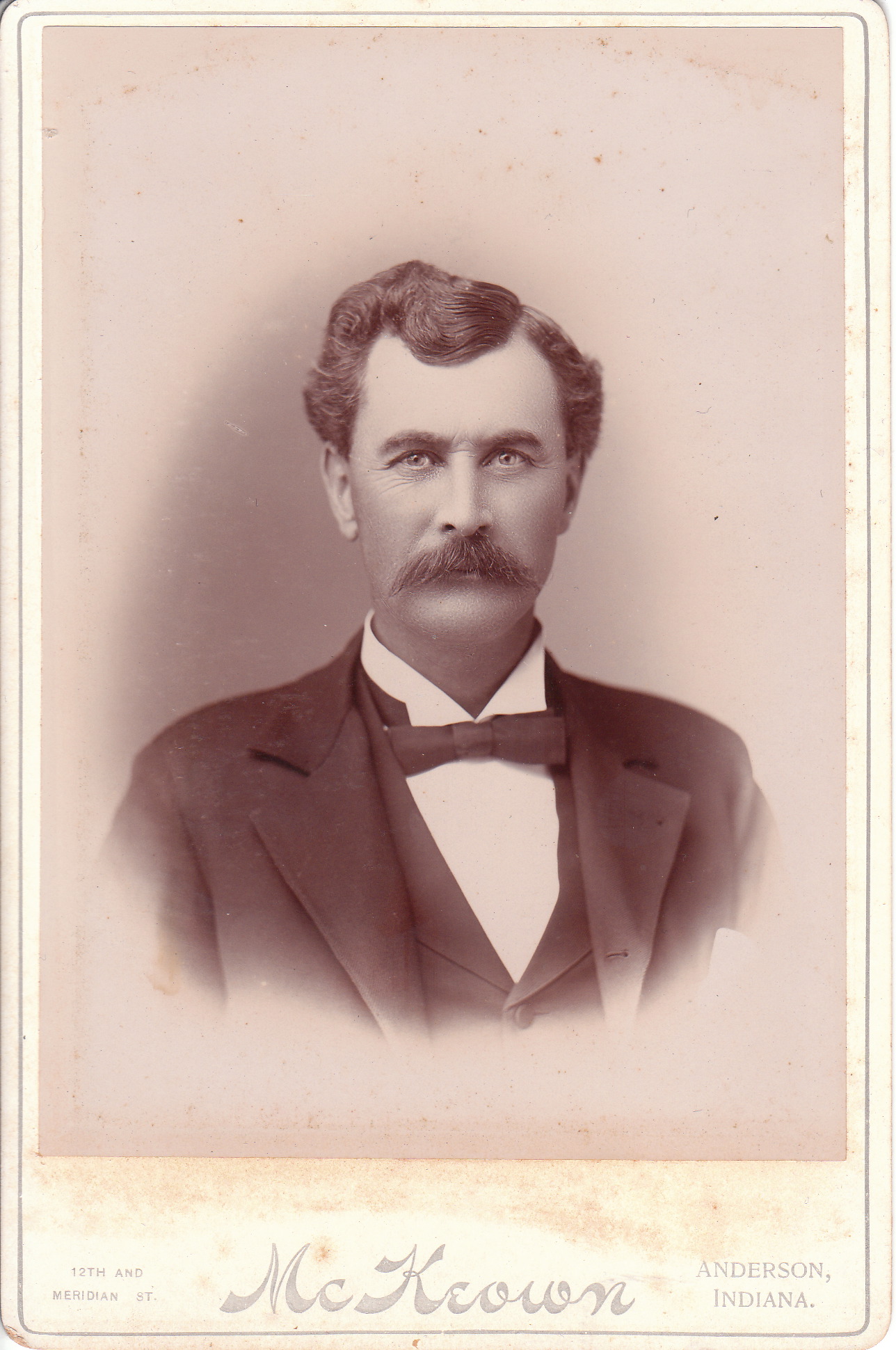 A handsome and well dressed gentleman sits for his photographic portrait at the studio of McKeown in Anderson, Indiana. His hairstyle can be described as complicated and requiring a high degree of maintenance.