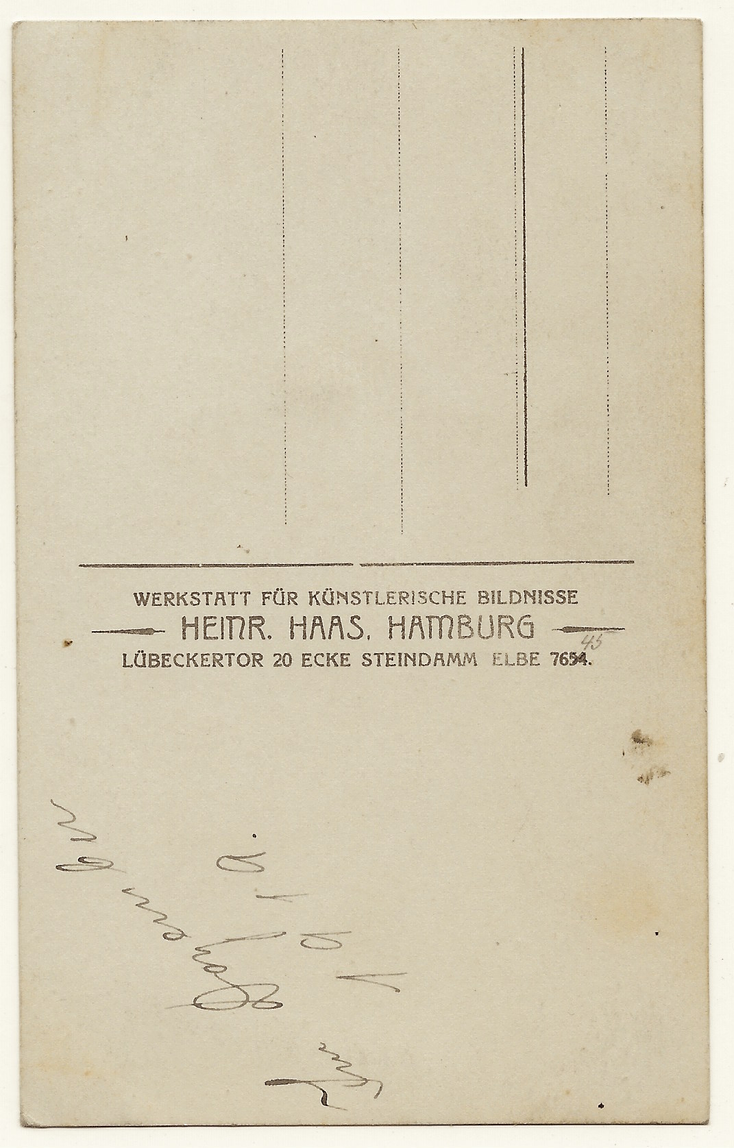 This cabinet card features a knight in shining armor. You can be sure that he did not ride up to the studio on his trusty steed. I wish I could report that this photograph’s subject was Sir Galahad, Richard the Lionhearted, or even one of the Three Musketeers. Unfortunately, the timing is a “little off”. Instead, the knight seen in this photograph is probably an actor. His armor is quite impressive. Note his gloves (gauntlets) and the hilt of his sword. His helmet is also interesting. He is wearing the helmet with the visor in the up position. This is a beautiful photograph and that is not surprising because it was taken by Emilie Bieber’s photo studio. Emilie Bieber (1810-1884) had two studios in Germany: Berlin and Hamburg. She operated the Hamburg studio 1852 through 1872, when she was joined by her nephew, Leonard Berlin-Bieber. Emilie Bieber died in 1884. This photograph was taken in 1906, after Emilie Bieber had died. The 1906 date of the photo is apparent by the fact that “1906” is embossed on the lower right hand corner of the image. That same date is stamped on the reverse of the cabinet card. This photograph is mounted on very thick cardstock. There is a “fault line” on the reverse of the image. It is barely visible in the scan. Due to the fact that the cardstock is thick, the “fault line” is only a cosmetic issue. The photo is in good condition (see scans).