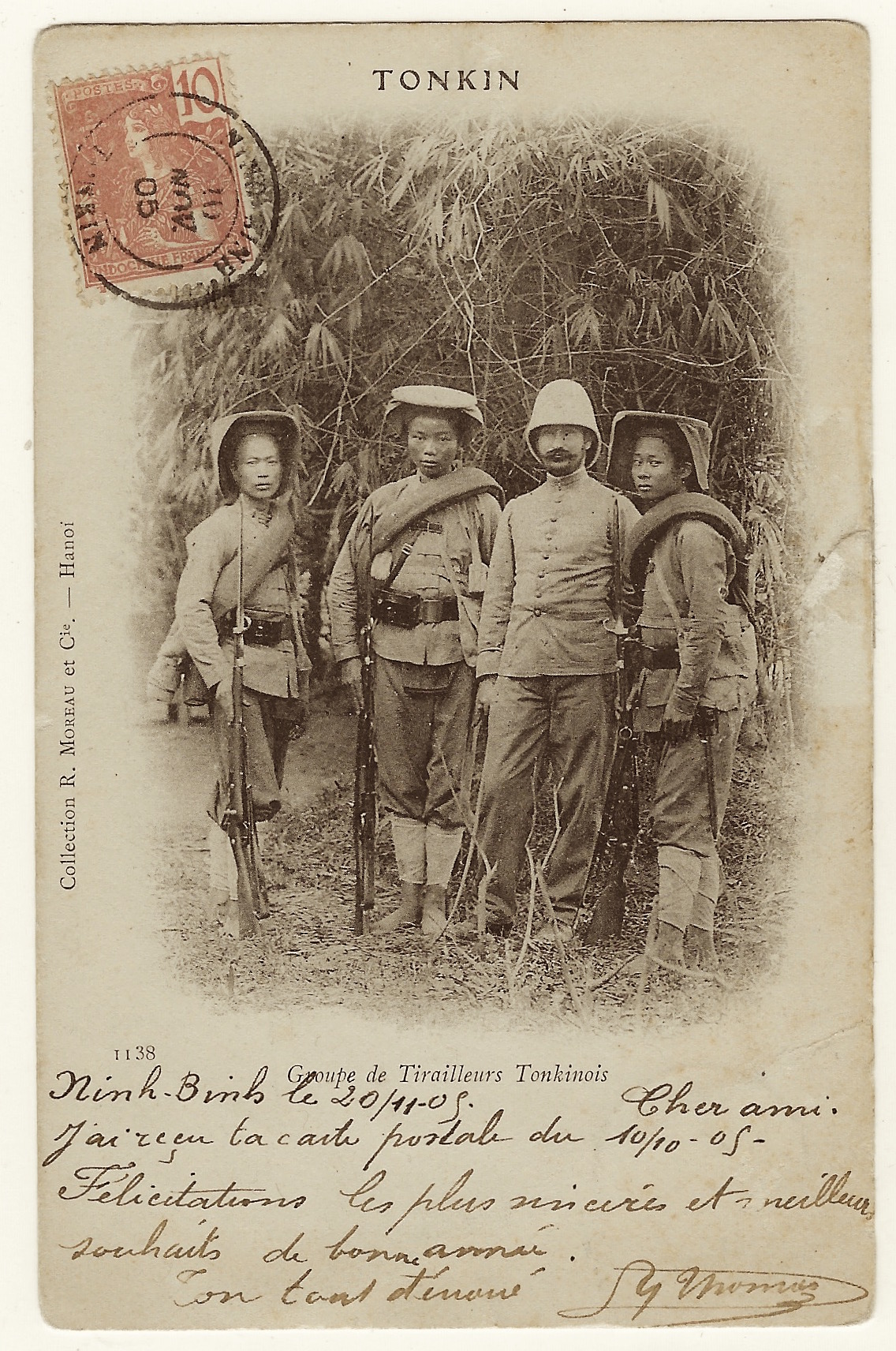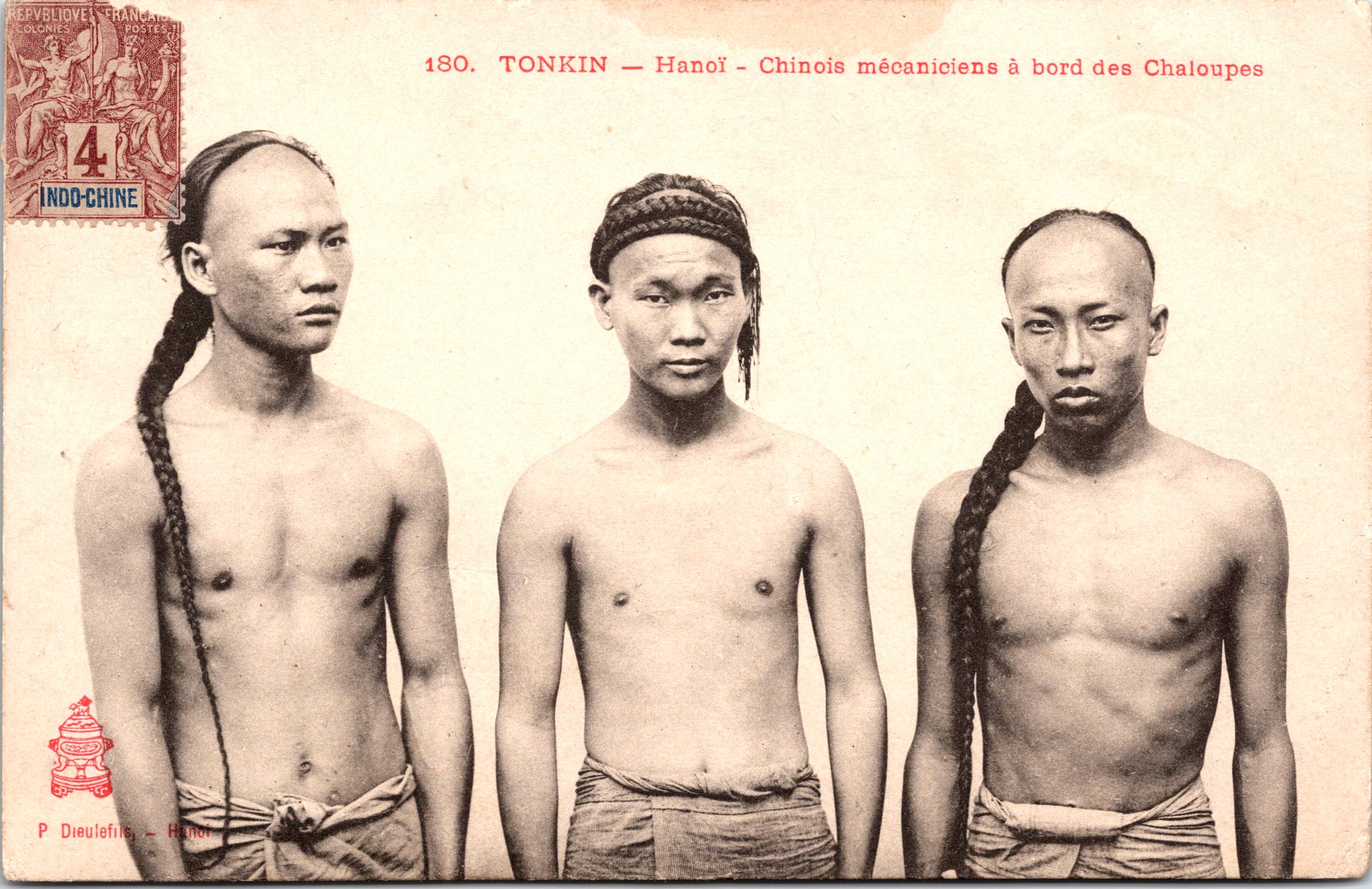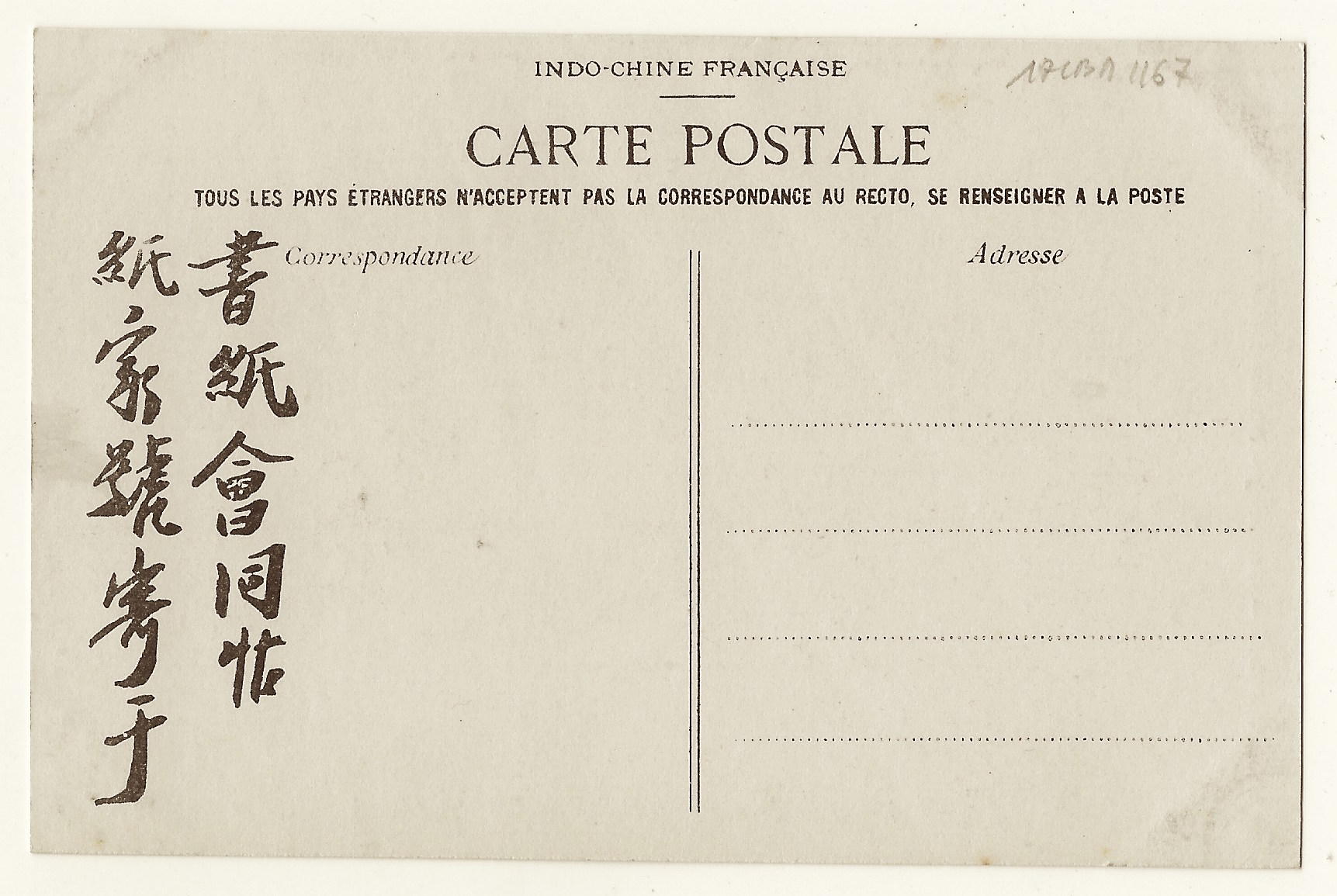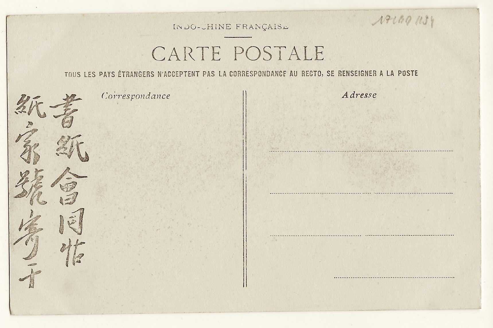This vintage real photo postcard features three bare chested Chinese men. Translating the caption reveals that the men are “Chinese mechanics aboard the boats”. This postcard is part of a series of Tonkin cards (#180). The publisher of this postcard is P. Dieulefils. He operated a studio in the city of Hanoi. Pierre Dieulefils was the first established professional photographer in Hanoi. In addition, he was a postcard editor and explorer. He had an excellent reputation as a photographer throughout Europe and Indochina. He won many medals at Universal Exhibitions. It is estimated that he produced approximately five thousand photos and postcards and he is considered one of the greatest photographers of the region. His photographic expeditions included such locales as Vietnam, China, and Cambodia. The card has an Indo-China stamp. (SOLD)