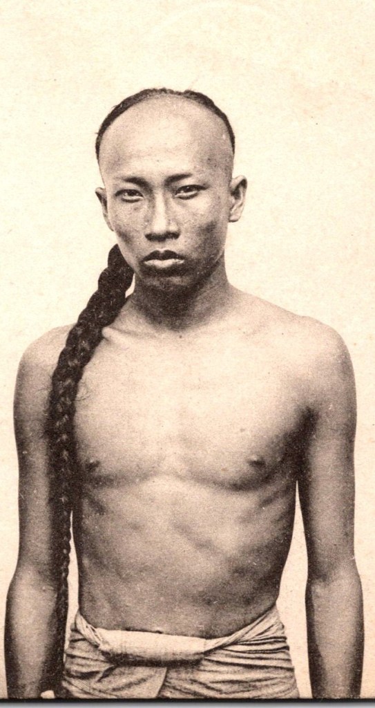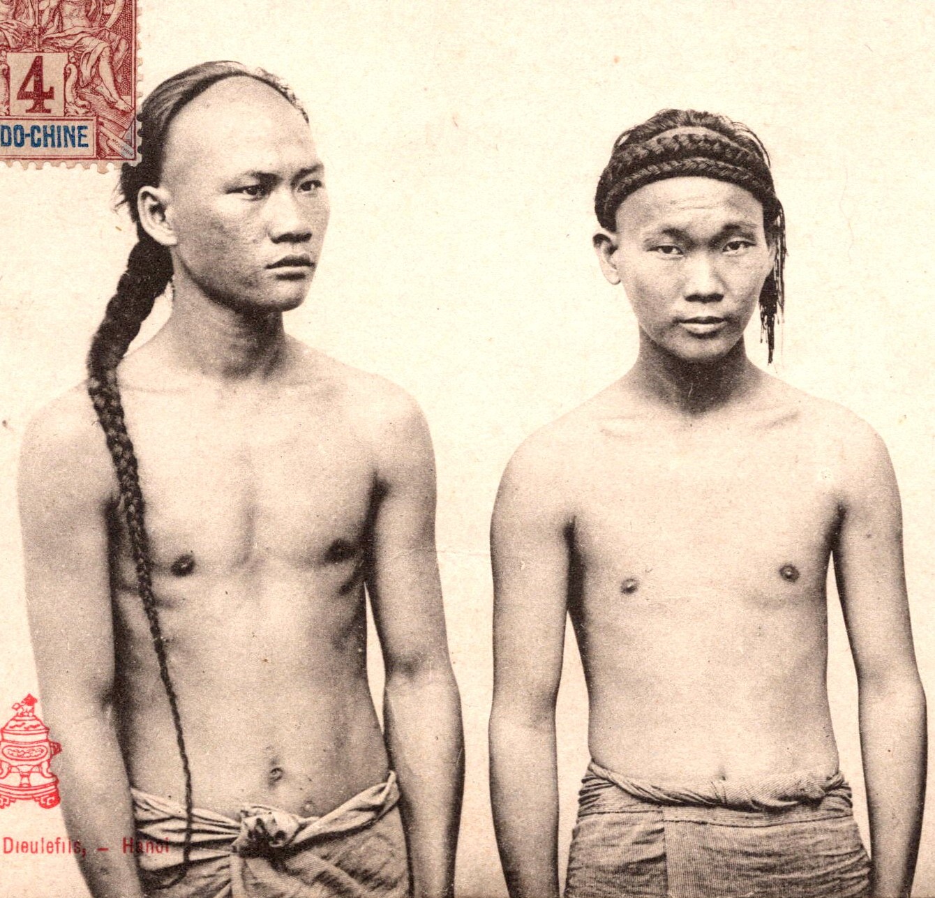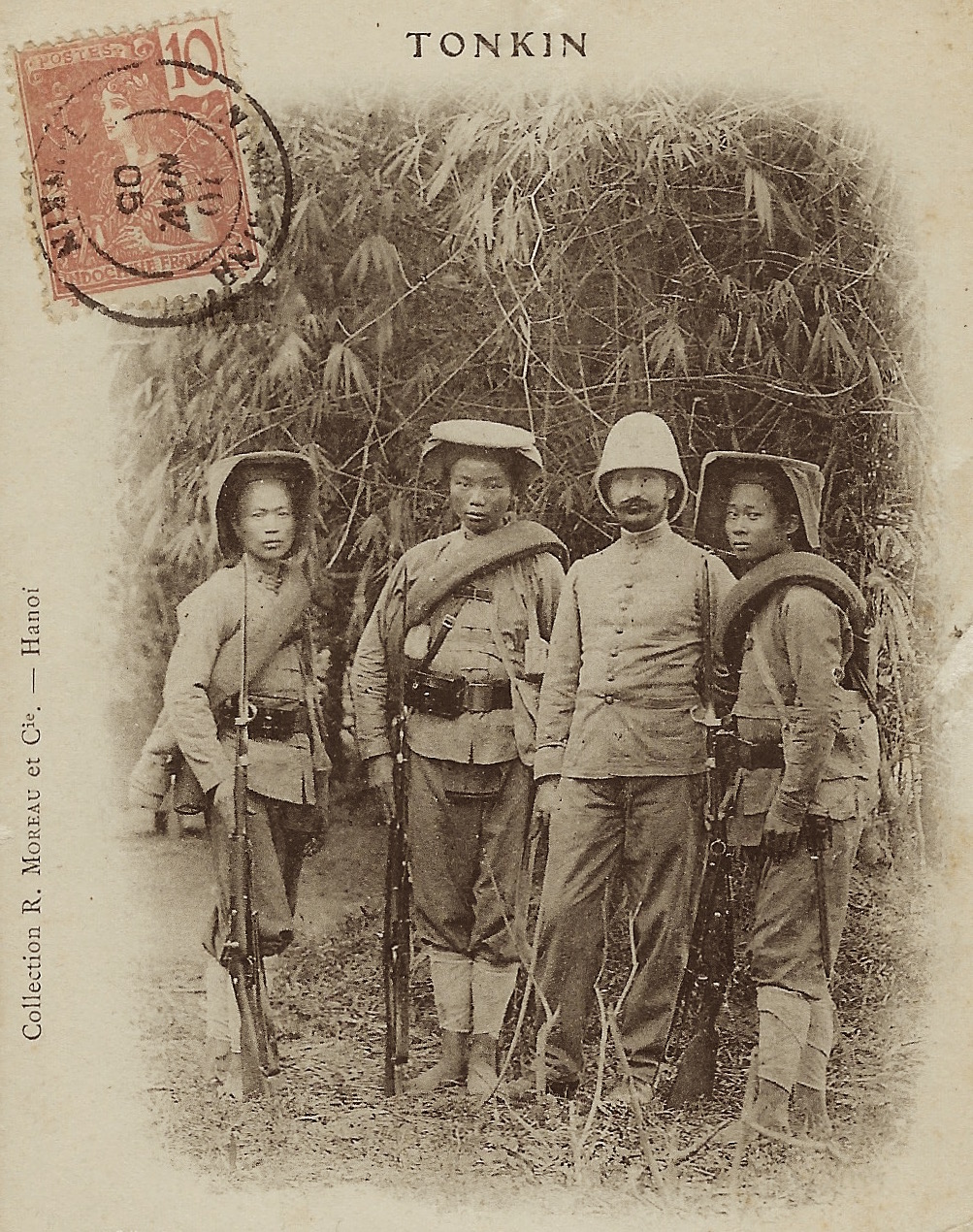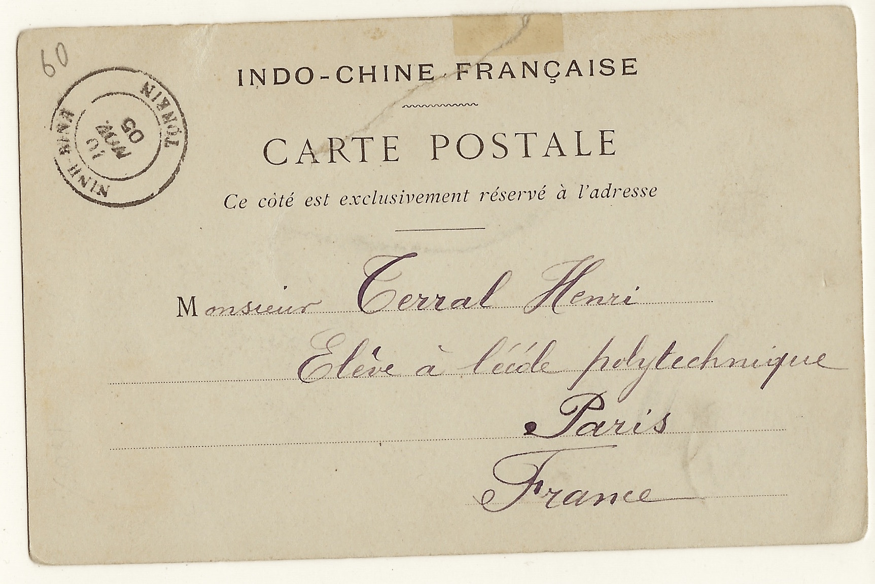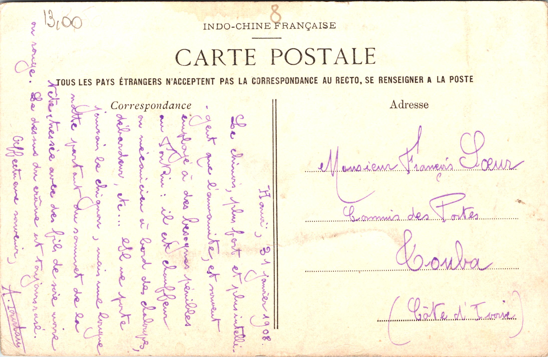This vintage real photo postcard features three bare chested Chinese men. Translating the caption reveals that the men are “Chinese mechanics aboard the boats”. This postcard is part of a series of Tonkin cards (#180). The publisher of this postcard is P. Dieulefils. He operated a studio in the city of Hanoi. Pierre Dieulefils was the first established professional photographer in Hanoi. In addition, he was a postcard editor and explorer. He had an excellent reputation as a photographer throughout Europe and Indochina. He won many medals at Universal Exhibitions. It is estimated that he produced approximately five thousand photos and postcards and he is considered one of the greatest photographers of the region. His photographic expeditions included such locales as Vietnam, China, and Cambodia. The card has an Indo-China stamp. (SOLD)