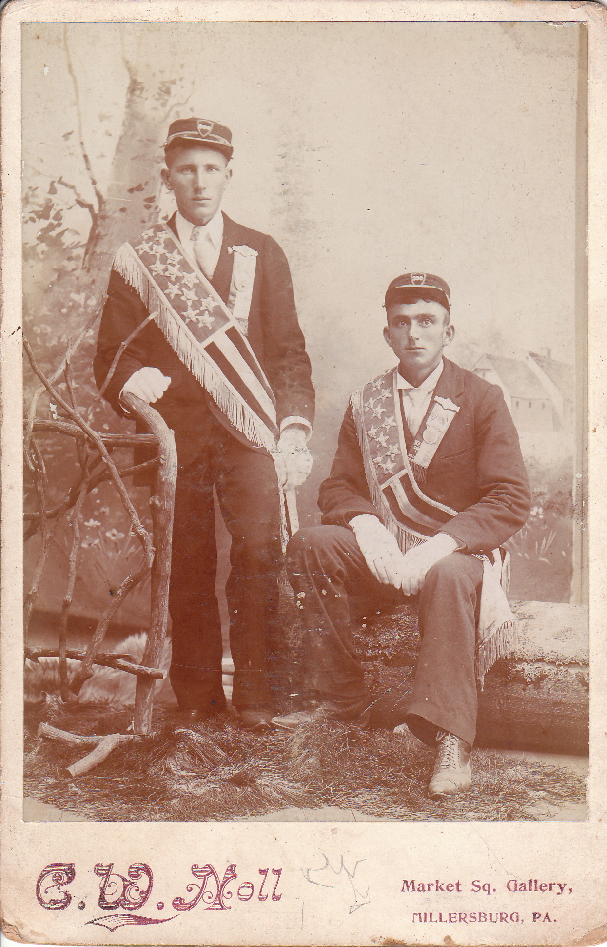 Cabinet Card’s often present more questions than answers; this is one of those images. The Cabinet Card features two men in uniform, wearing sashes that look like a portion of the American flag. Both men are wearing caps that display a number. Each man is also wearing a badge and ribbons on their jacket. One of the ribbons may say Washington Campaign and have Millersburg written on the bottom line, but this is just a hypothesis. Hopefully, a visitor to this site will share a more informed opinion about what organization these men may be representing. Are they Firemen, Railroad Workers, Military Veterans, Fraternal Organization Members, or some other specific occupational or service group? The photographer is Charles W. Noll. If his nickname was Chuck, than he is the unofficial namesake of the former football coach, Chuck Noll of the Pittsburgh Steelers. The photographer is listed in the Harrisburg, Pennsylvania directories of 1902 and 1904.