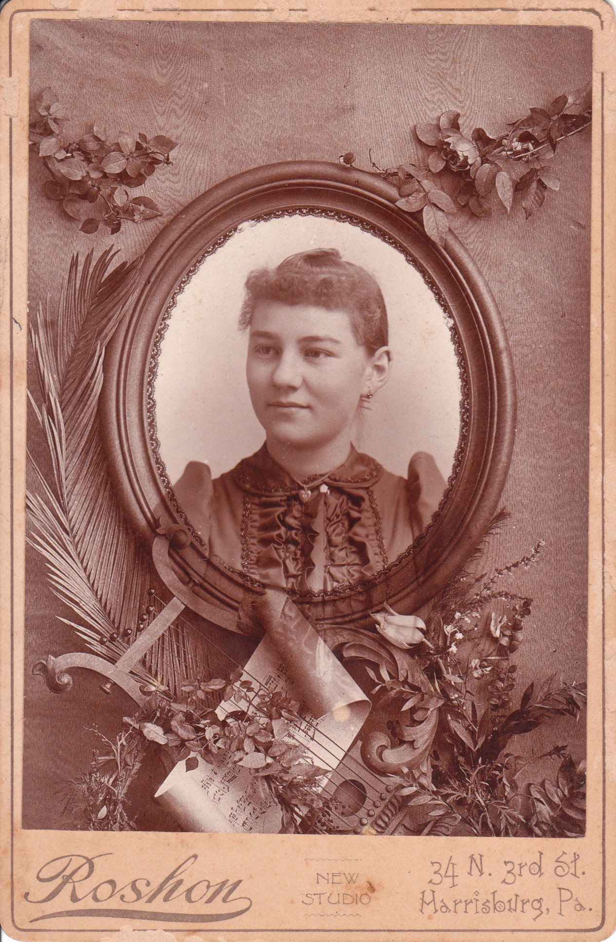 A young woman is featured in this cabinet card that appears to be a memorial photograph. The image has a musical theme. Note the pictured string instrument and the scrolled sheet music. Perhaps the young woman pictured in the frame was a musician. The photographic studio responsible for this interesting image is the C. S. Roshon studio which was located in Harrisburg, Pennsylvania. The cabinet card gallery has another Roshon photograph in its collection). This second photograph is one of the more controversial images in the gallery’s collection because it very well may be a counterfeit cabinet card. The image features a Native American man with a turkey vulture on his head. Click on the category “Photographer: Roshon” to view this photograph.